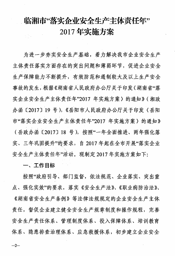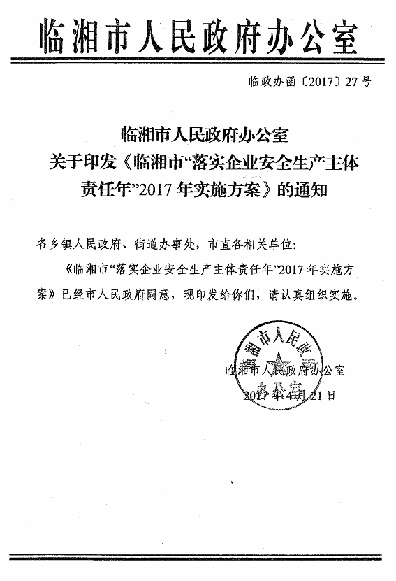 关于印发《临湘市“落实企业安全生产主体责任年”2017年实施方案》通知
