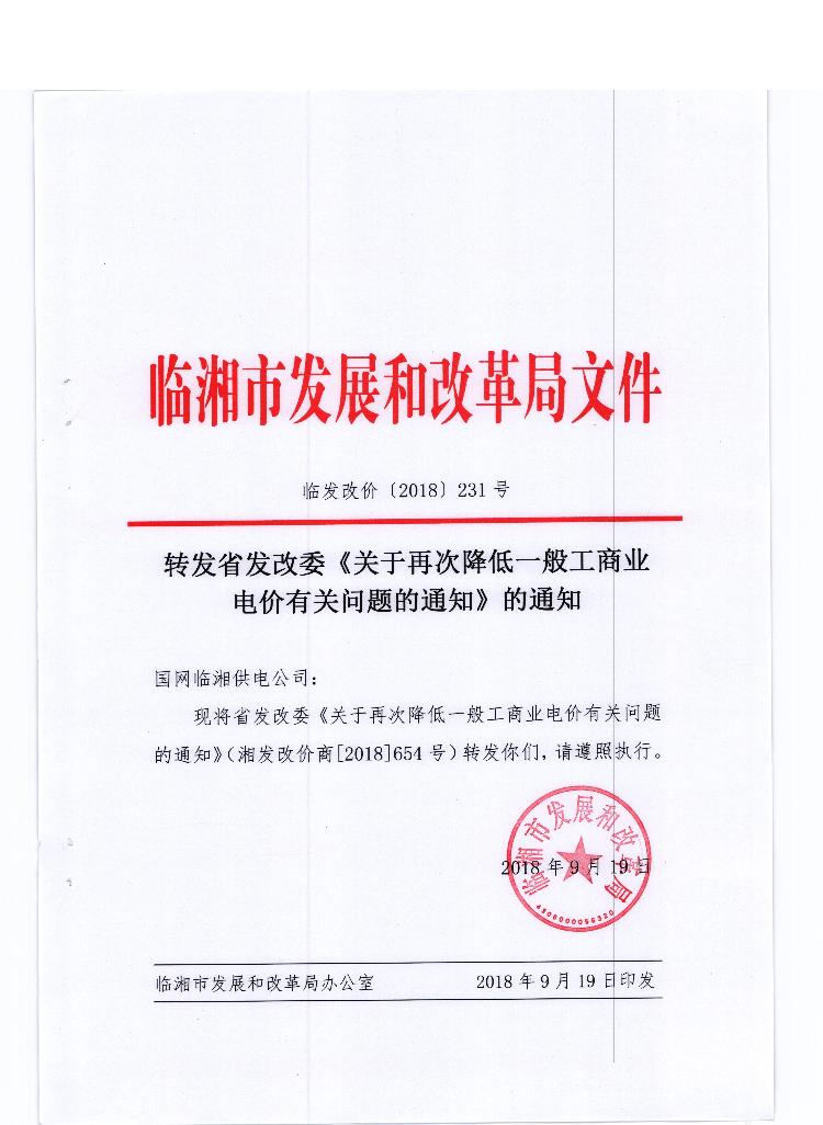 转发省发改委《关于再次降低一般工商业电价有关问题的通知》的通知
