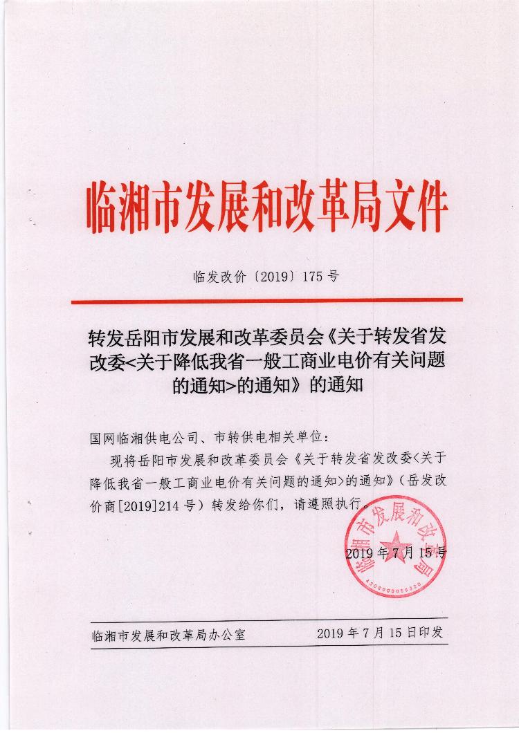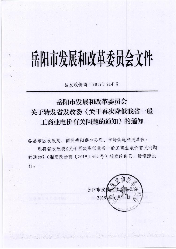 关于转发岳阳市发展和改革委员会《关于转发省发改委 关于降低我省一般工商业电价有关问题的通知 的通知》的通知