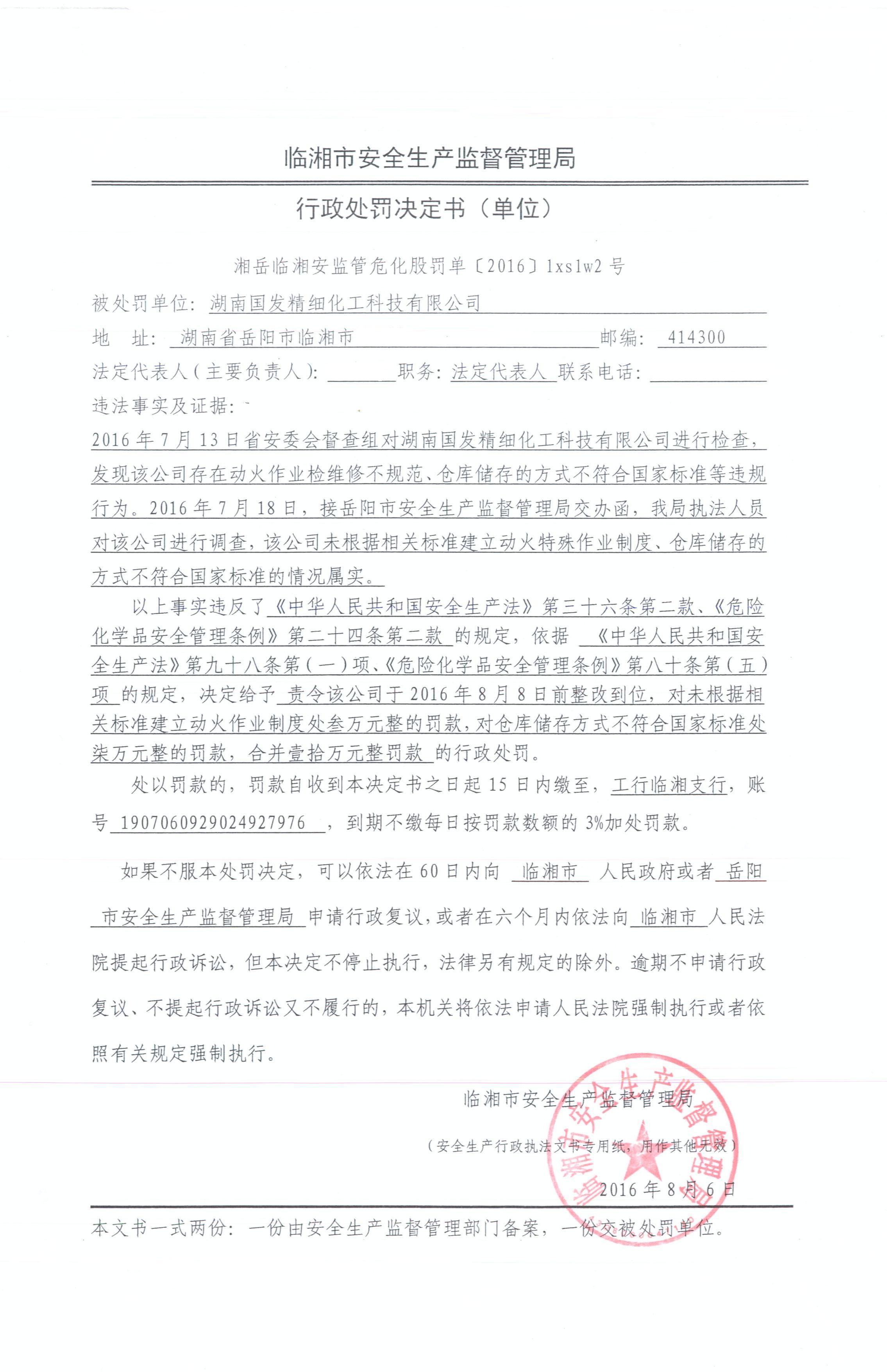 对湖南国发精细化工科技有限公司的行政处罚决定书