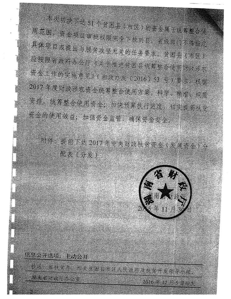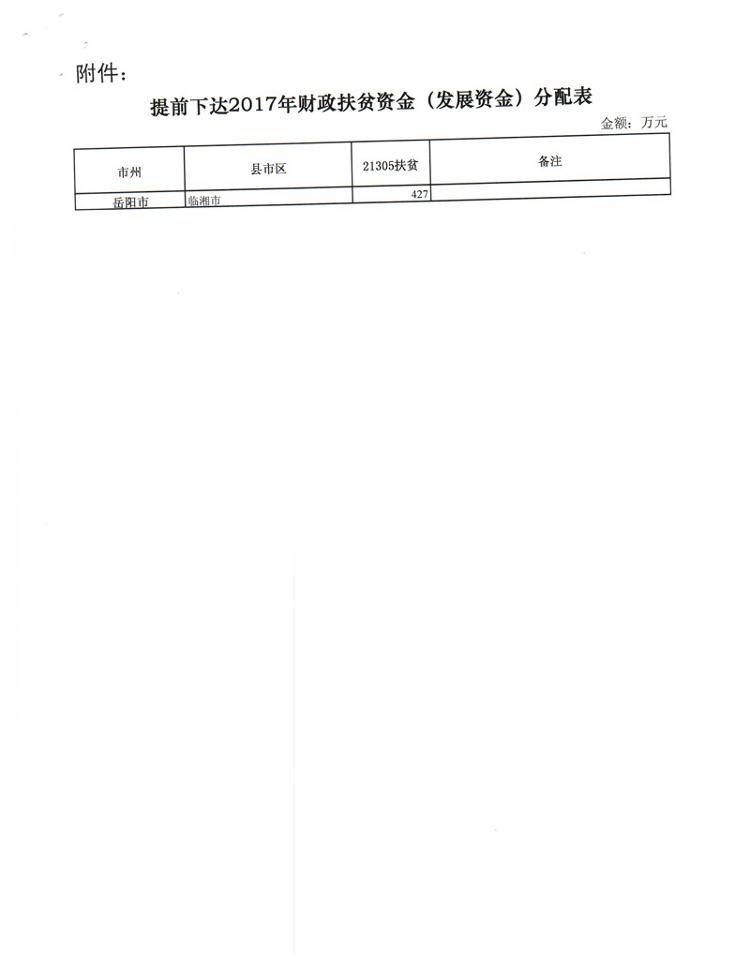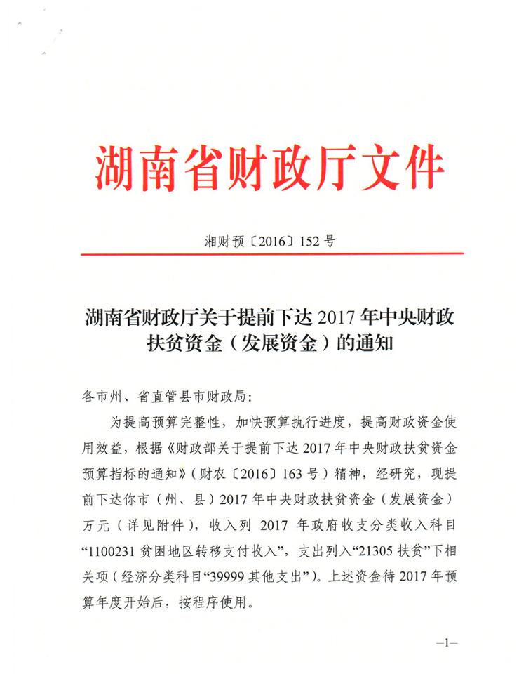 湖南省财政厅关于提前下达2017年中央财政扶贫资金(发展资金)的通知