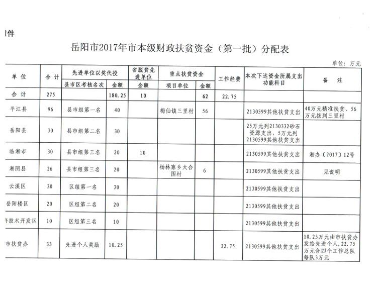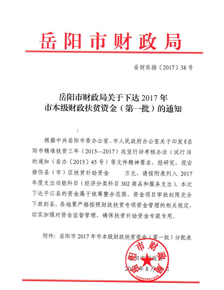 岳阳市财政局关于下达2017年市本级财政扶贫资金(第一批)的通知