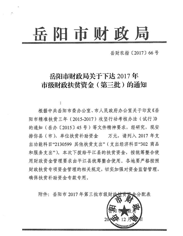 岳阳市财政局关于下达2017年市级财政扶贫资金(第三批)的通知