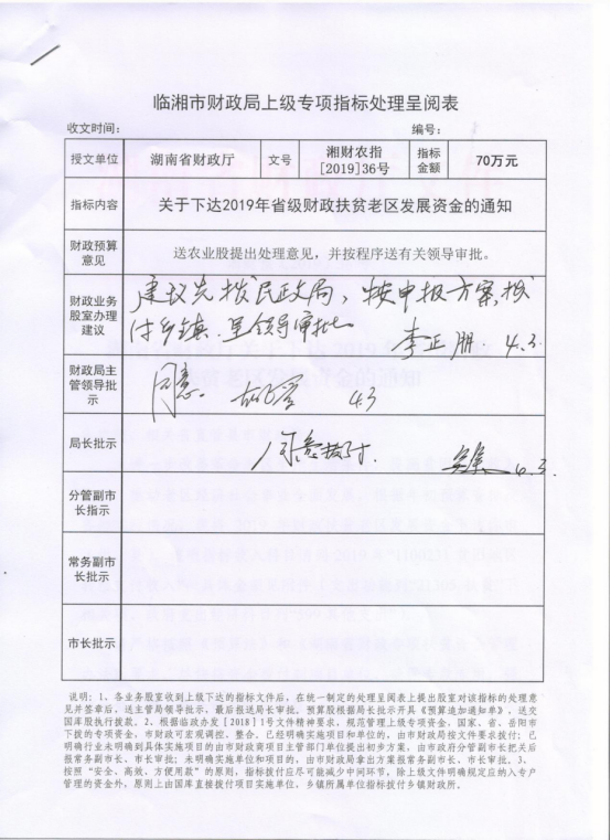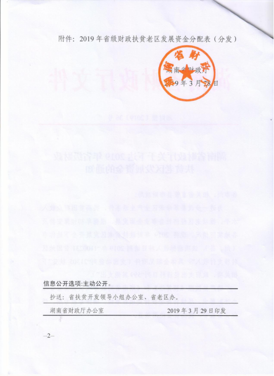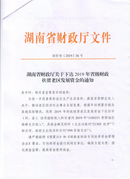 湖南省财政厅关于下达2019年省级财政扶贫老区发展资金的通知
