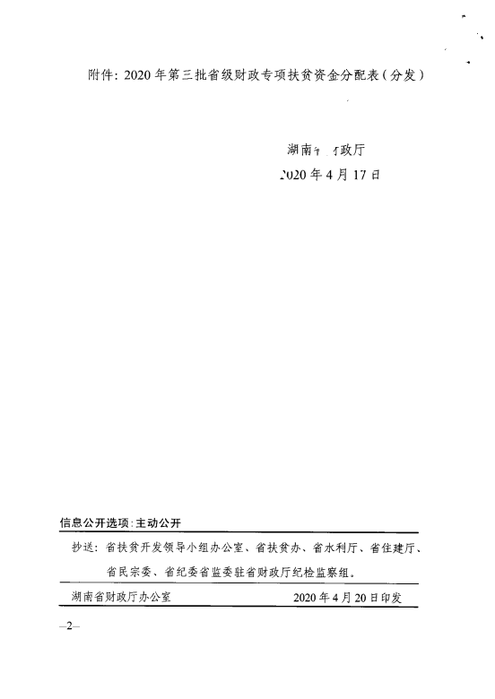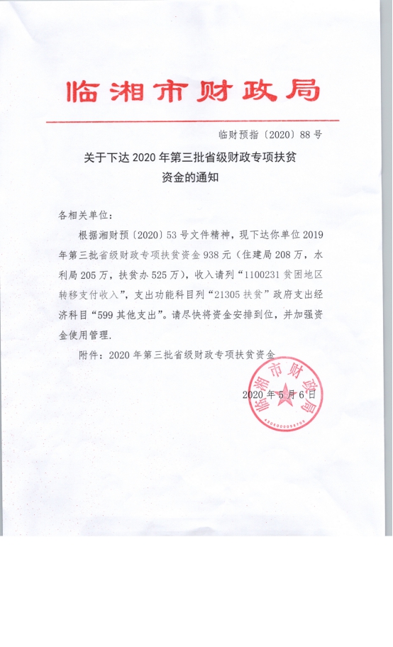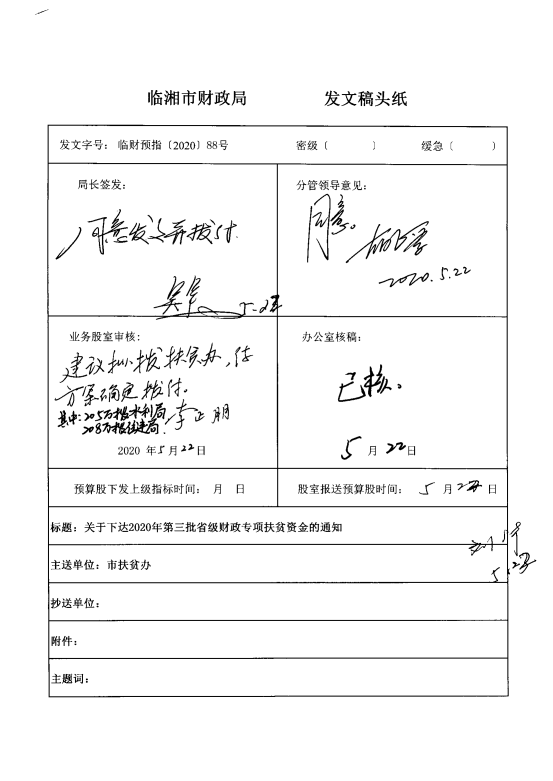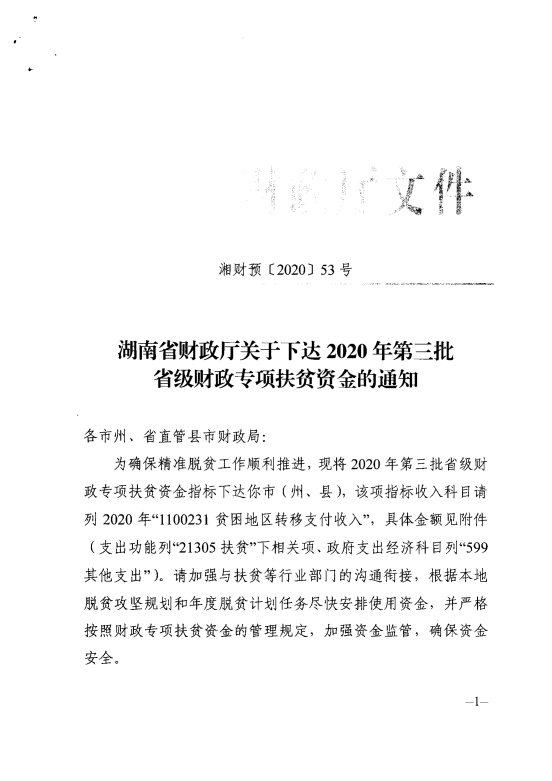 关于下达2020年第三批省级财政专项扶贫资金 湘财预(2020)53号
