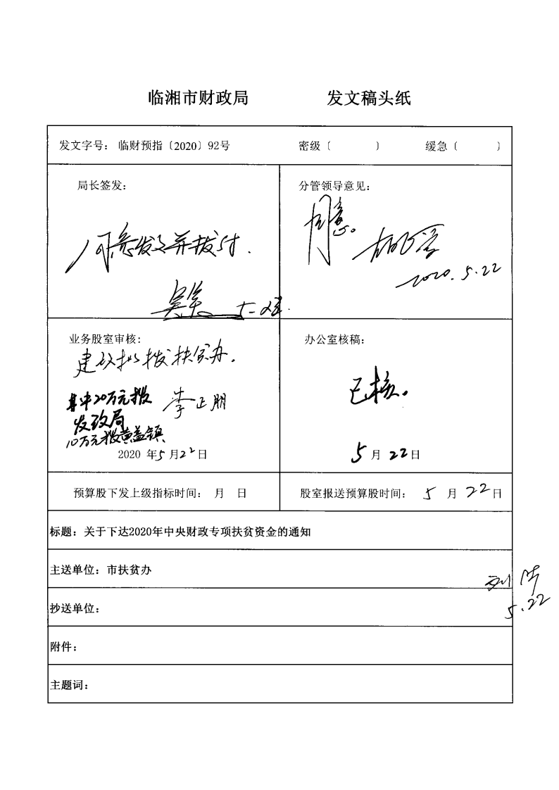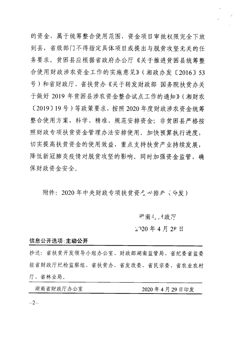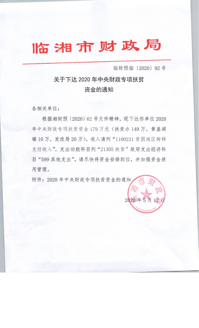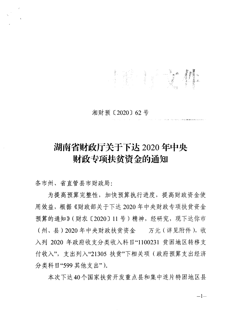关于下达2020年中央财政专项扶贫资金 湘财预(2020)62号