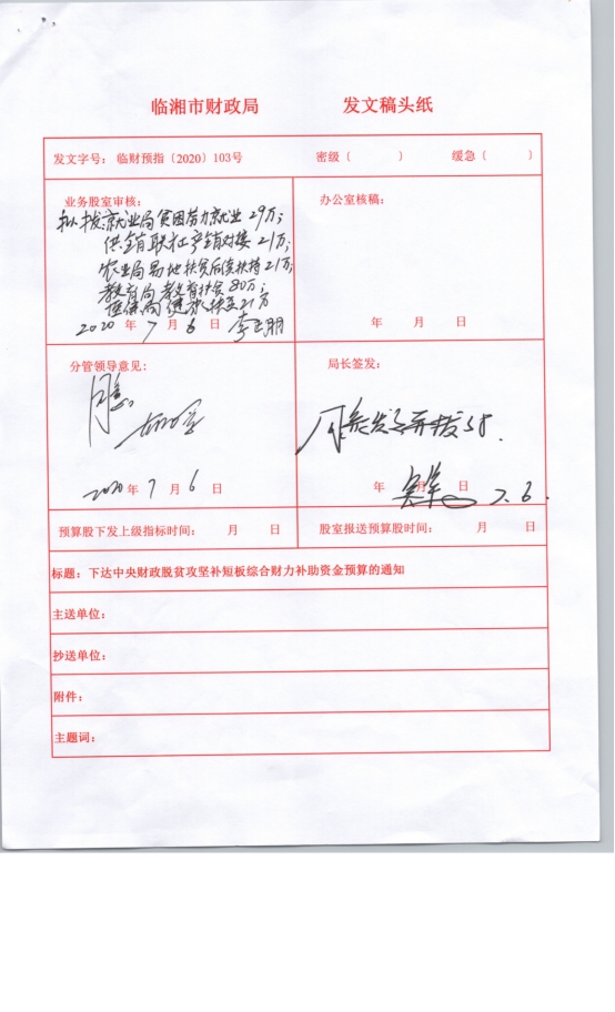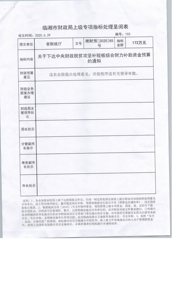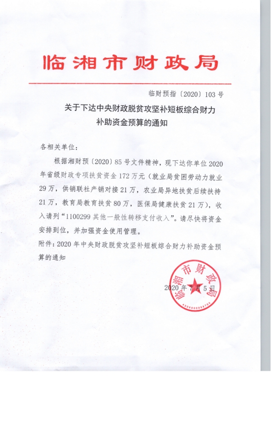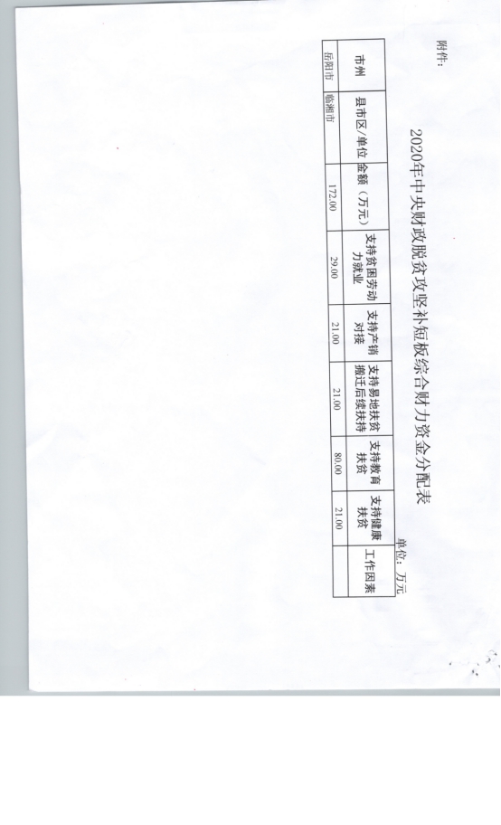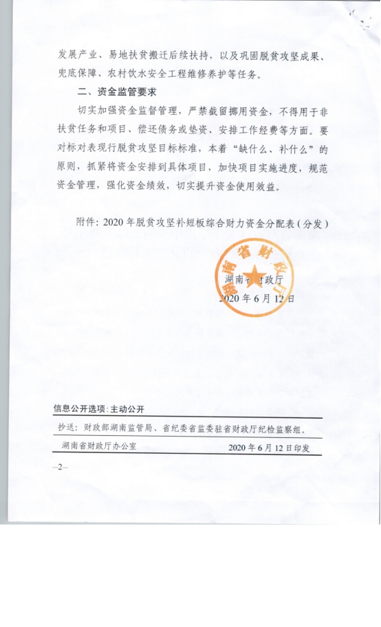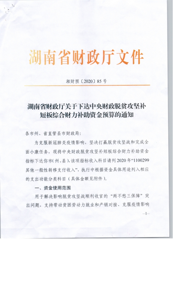 下达中央财政脱贫攻坚补短板综合财力补助资金 湘财预【2020)85号