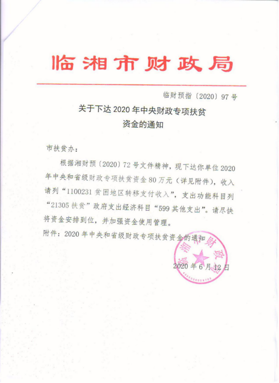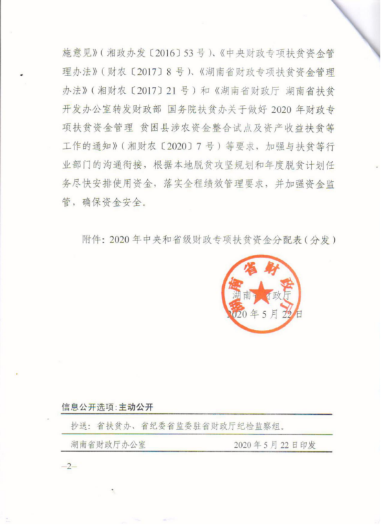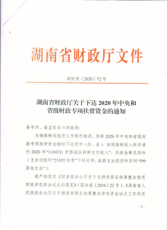 关于下达2020年中央和省级财政专项扶贫资金 湘财预【2020】72号