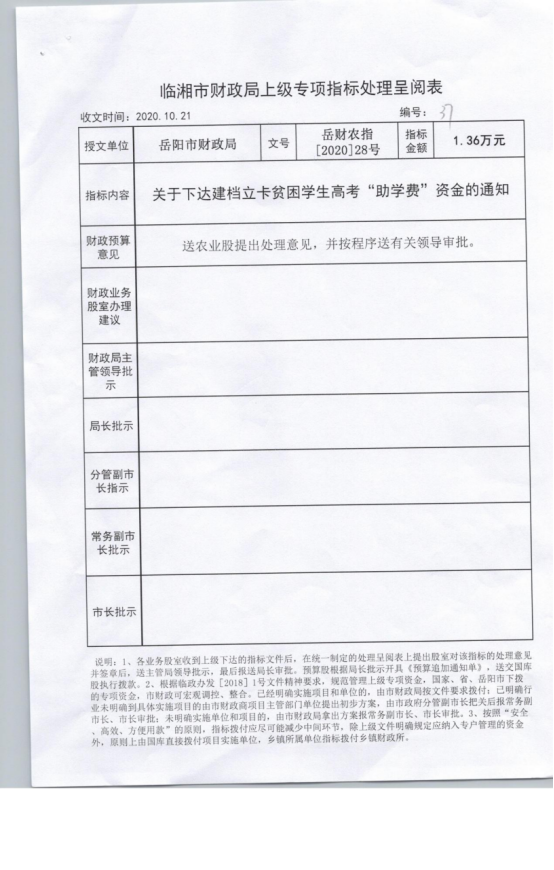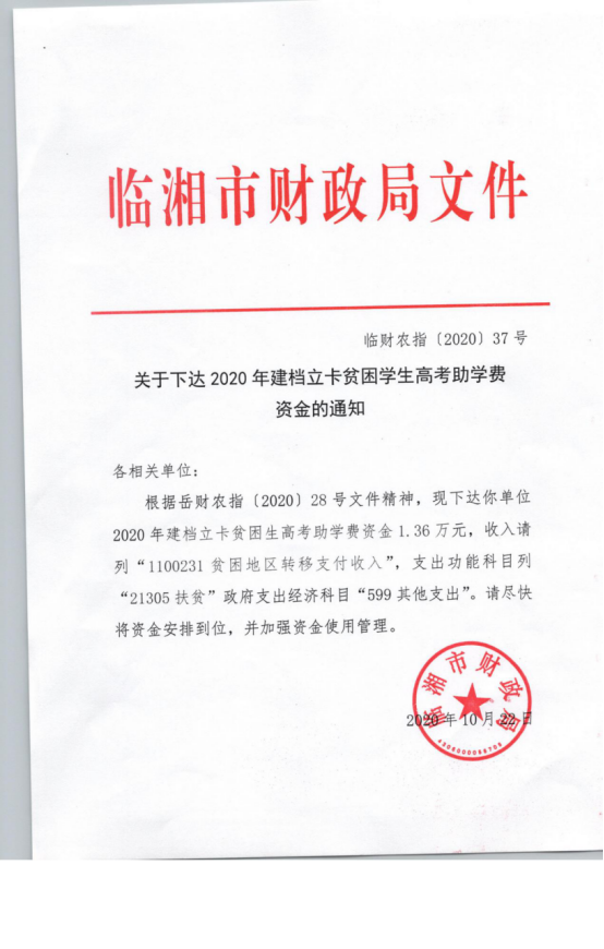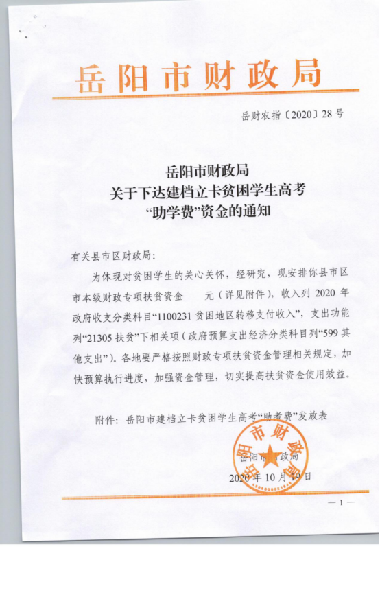 下达建档立卡贫困学生高考助学费资金 岳财农指(2020)28号