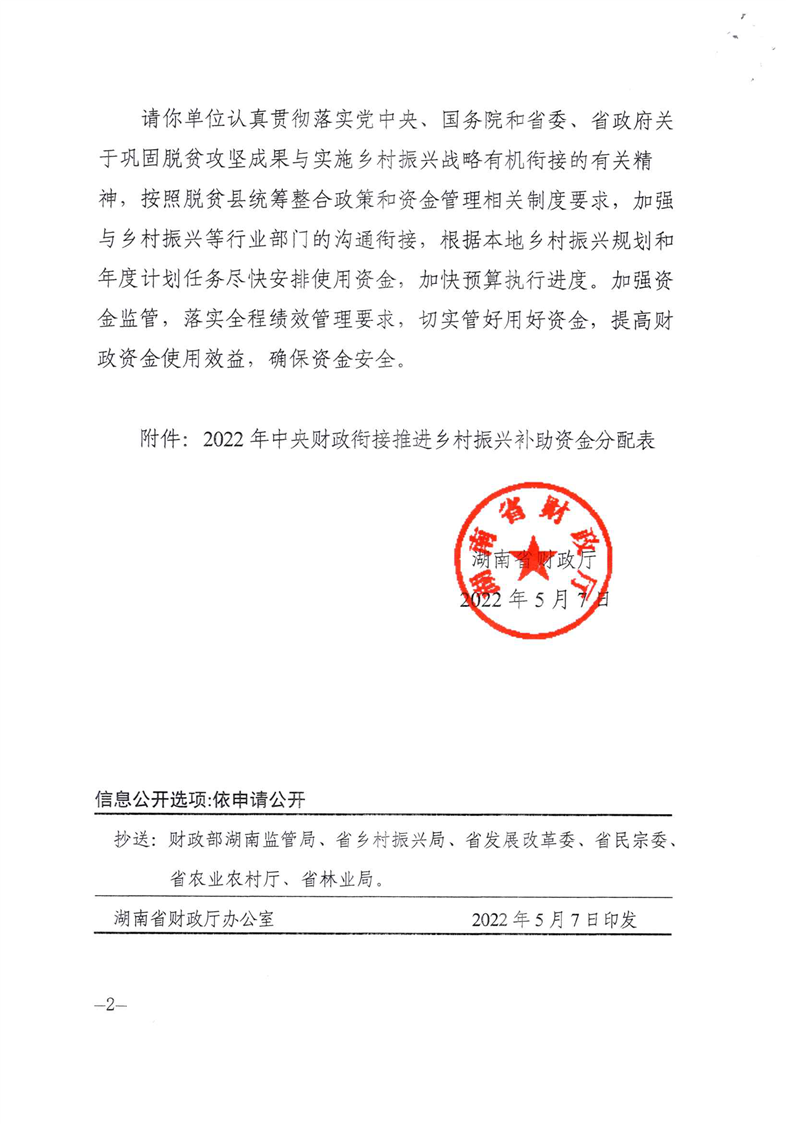 湖南省财政厅关于下达2022年中央财政衔接推进乡村振兴补助资金的通知