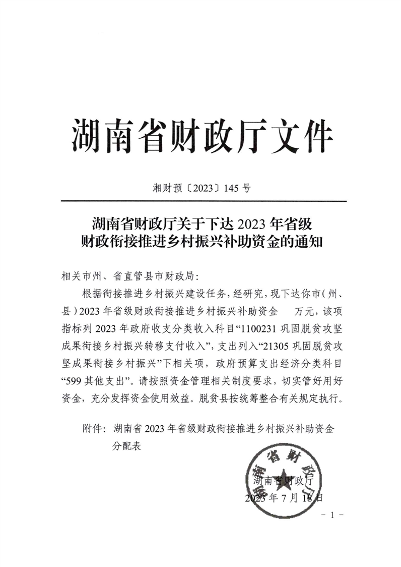 湖南省财政厅关于下达2023年省级财政衔接推进乡村振兴补助资金的通知(湘财预〔2023〕145号)