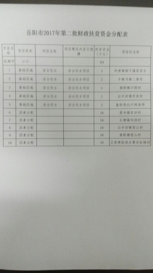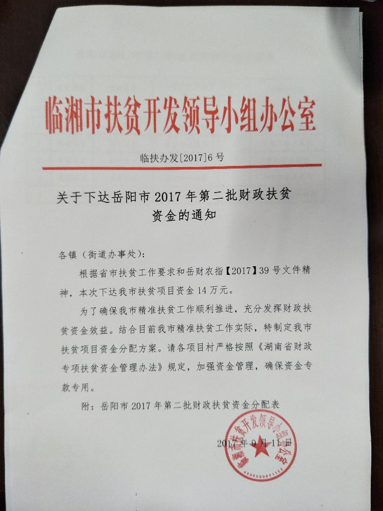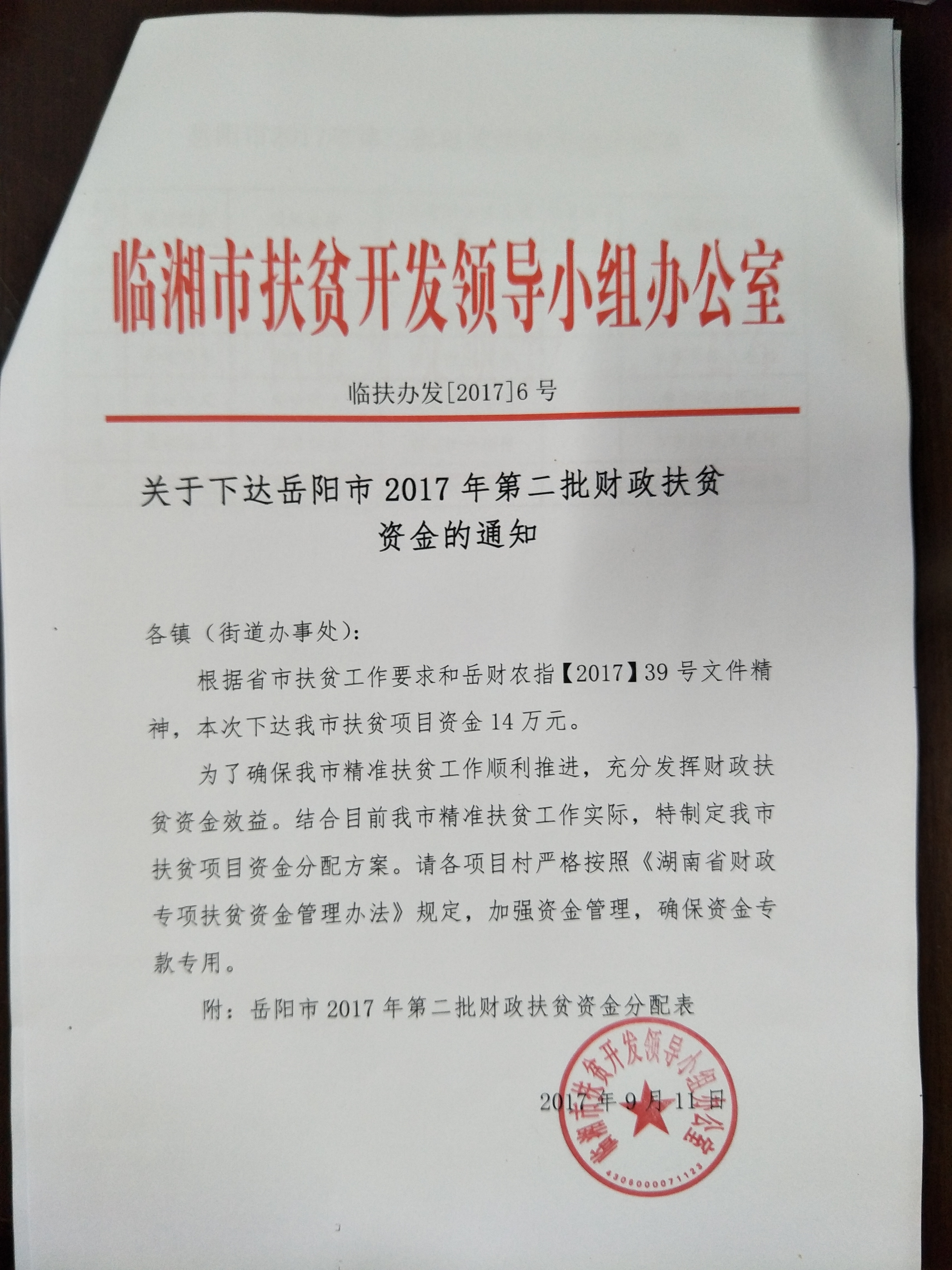 关于下达岳阳市2017年第二批财政扶贫资金的通知