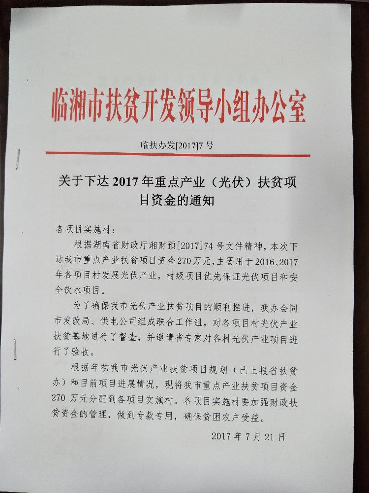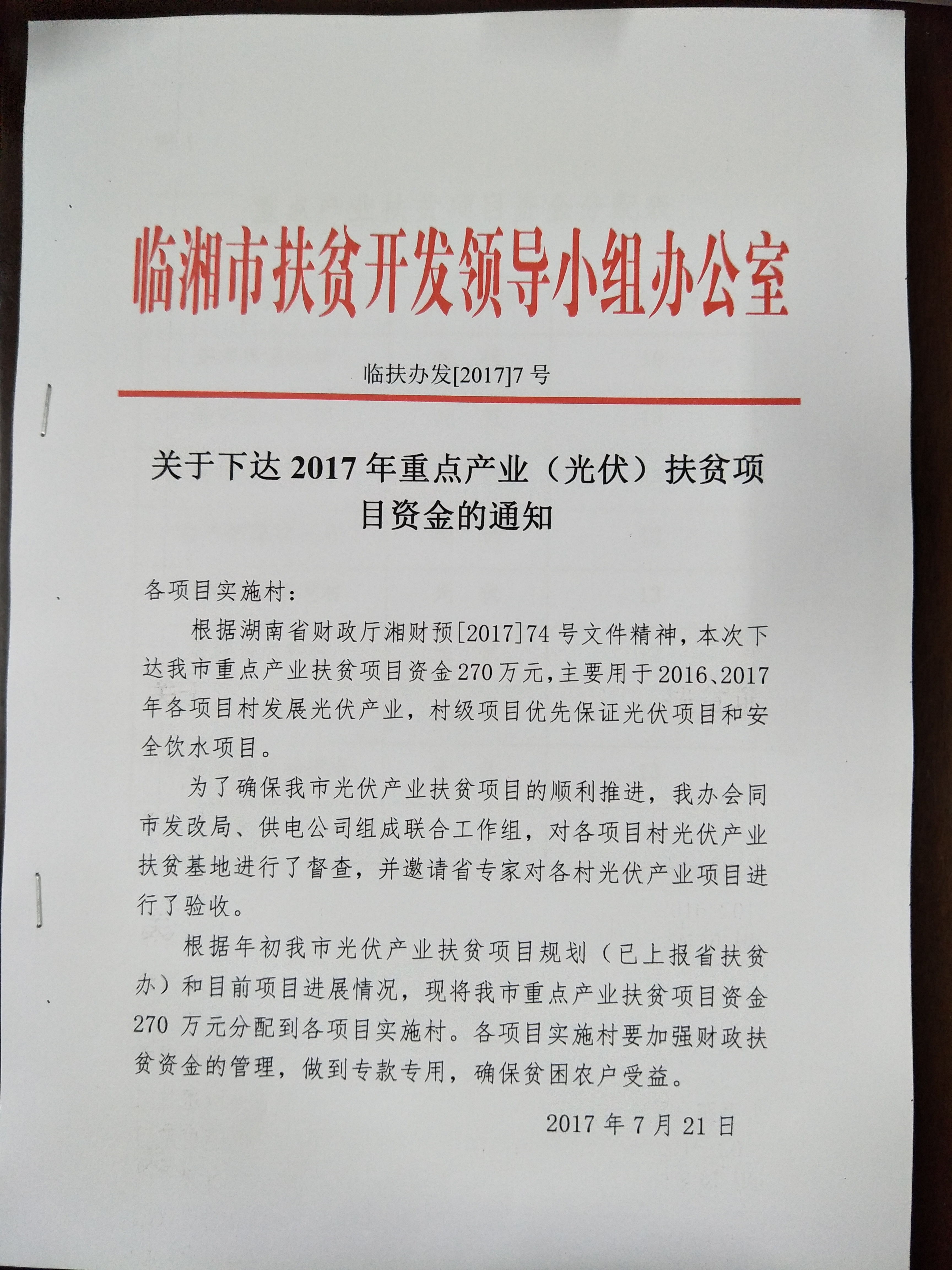关于下达2017年重点产业(光伏)扶贫项目资金的通知