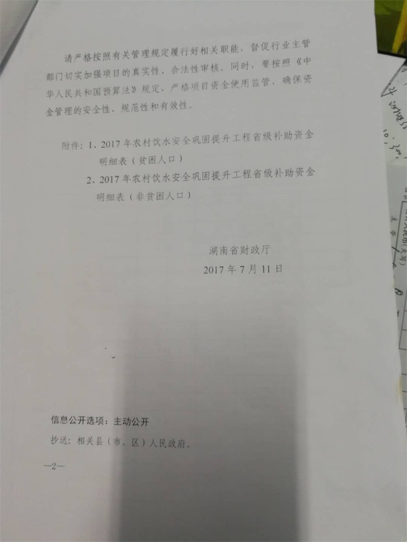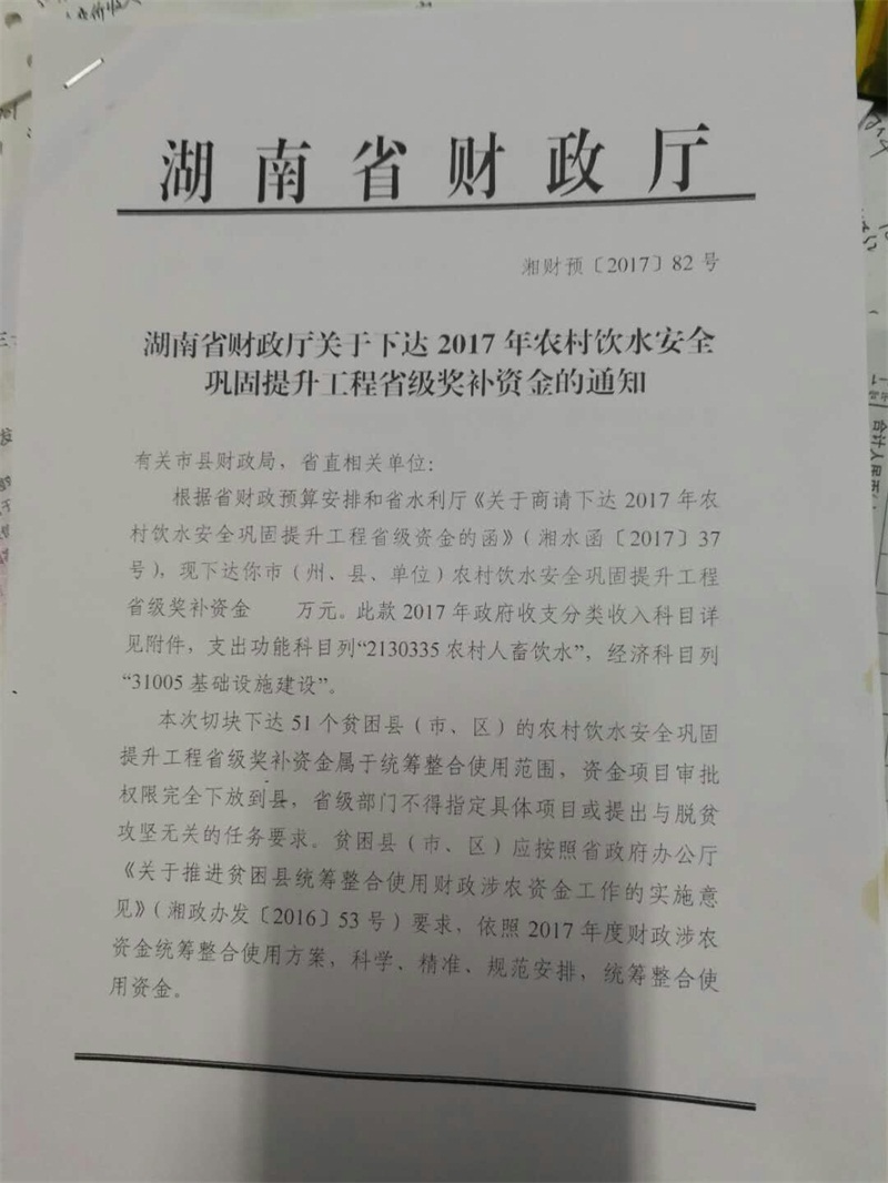 湖南省财政厅关于下达2017年农村饮水安全巩固提升工程省级奖补资金的通知