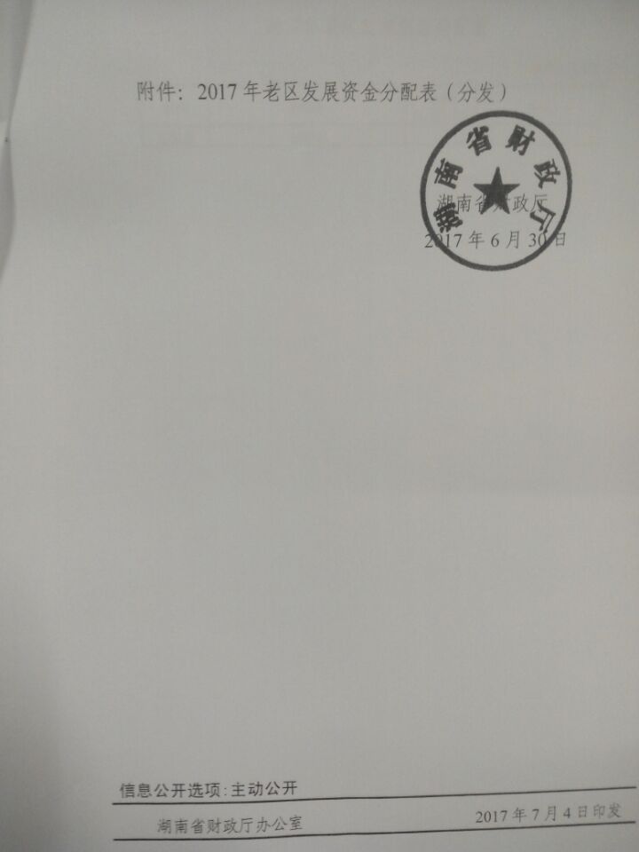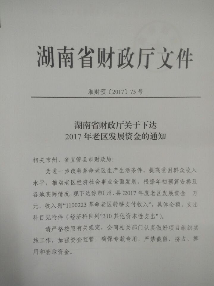 湖南省财政厅关于下达2017年老区发展资金的通知