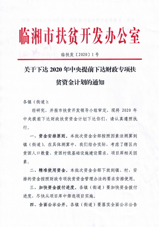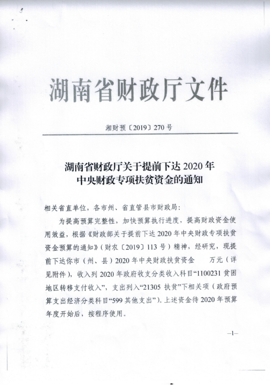 关于提前下达2020年中央财政专项扶贫资金计划的通知