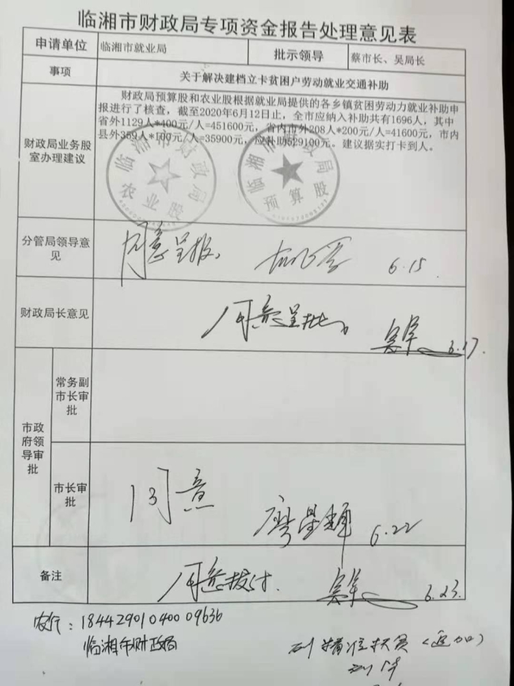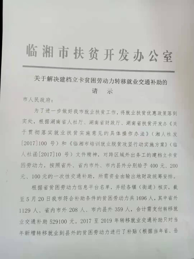 临湘市2020年县级扶贫资金(交通补贴)