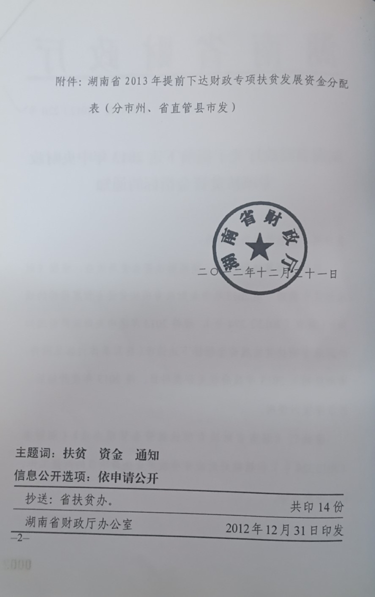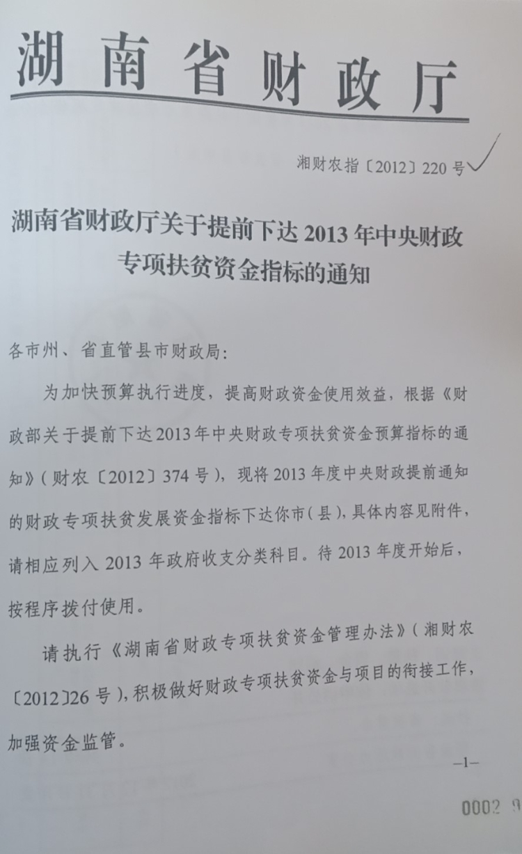 湖南省财政厅关于提前下达2013年中央财政专项扶贫资金指标的通知(湘财农指[2012]220号)