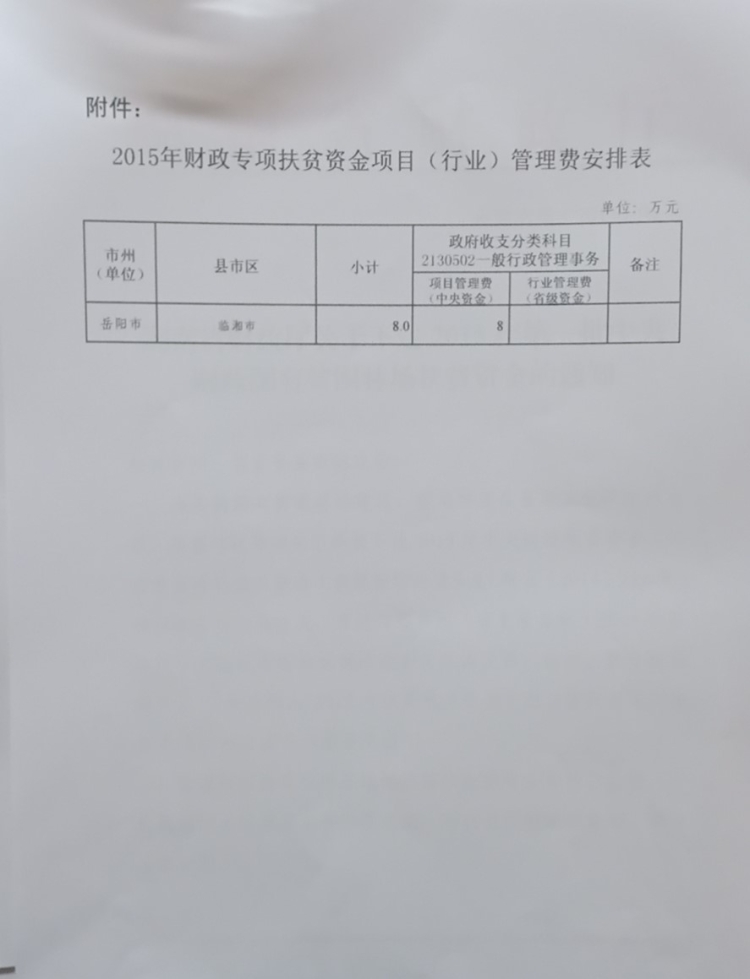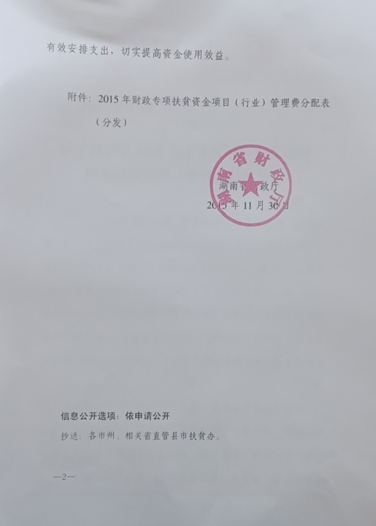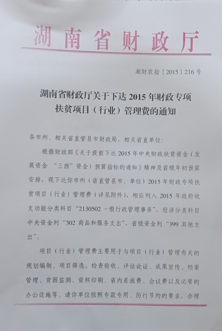 湖南省财政厅关于下达2015年财政专项扶贫项目(行业)管理费的通知(湘财农指【2015】216号】)