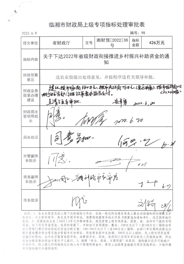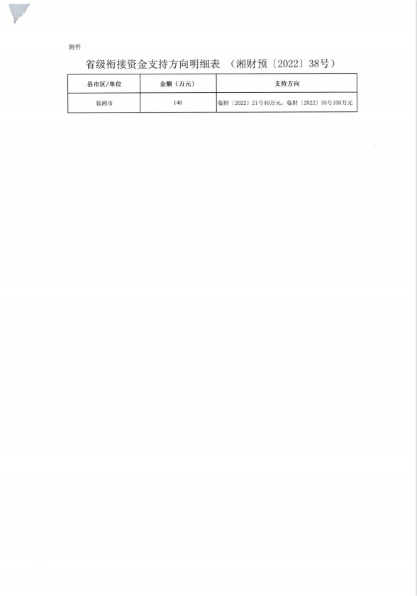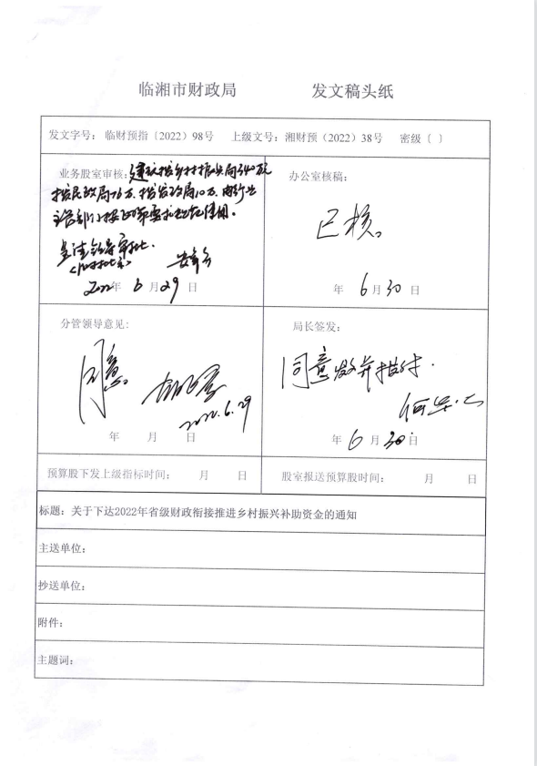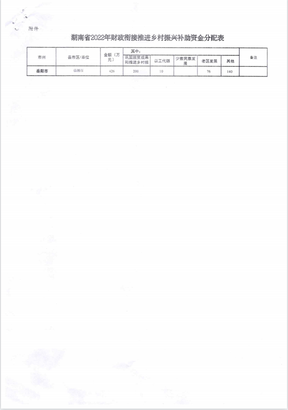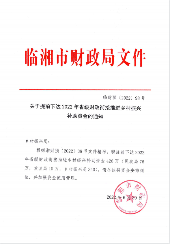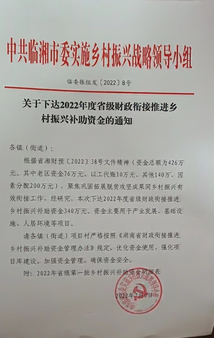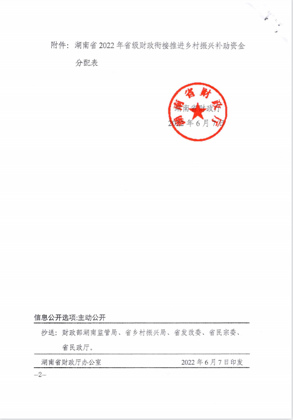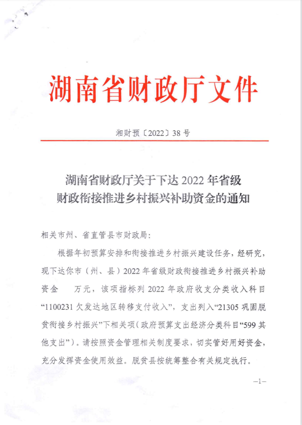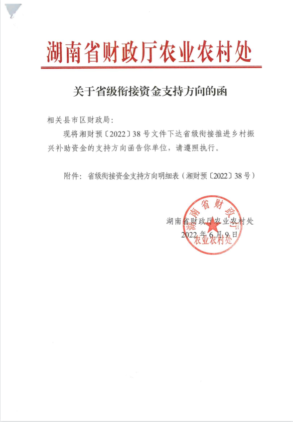 湖南省财政厅关于下达2022年省级财政衔接推进乡村振兴补助资金的通知(湘财预【2022】38号)