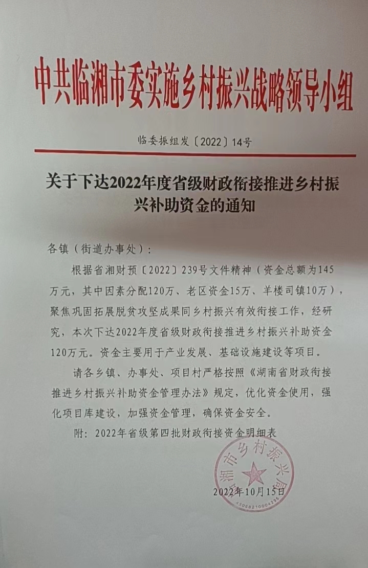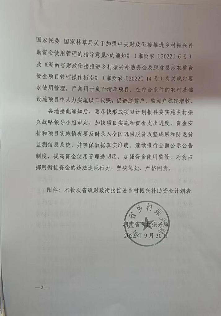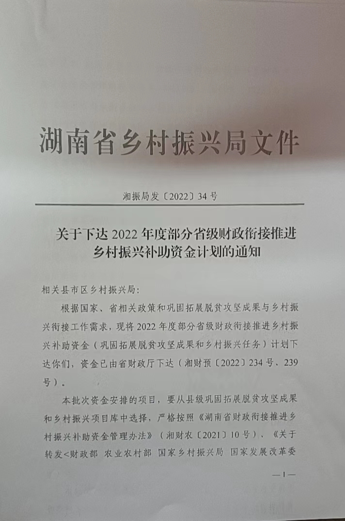 关于下达2022年市级财政衔接推进乡村振兴补助资金的通知(湘财预[2022]239号)