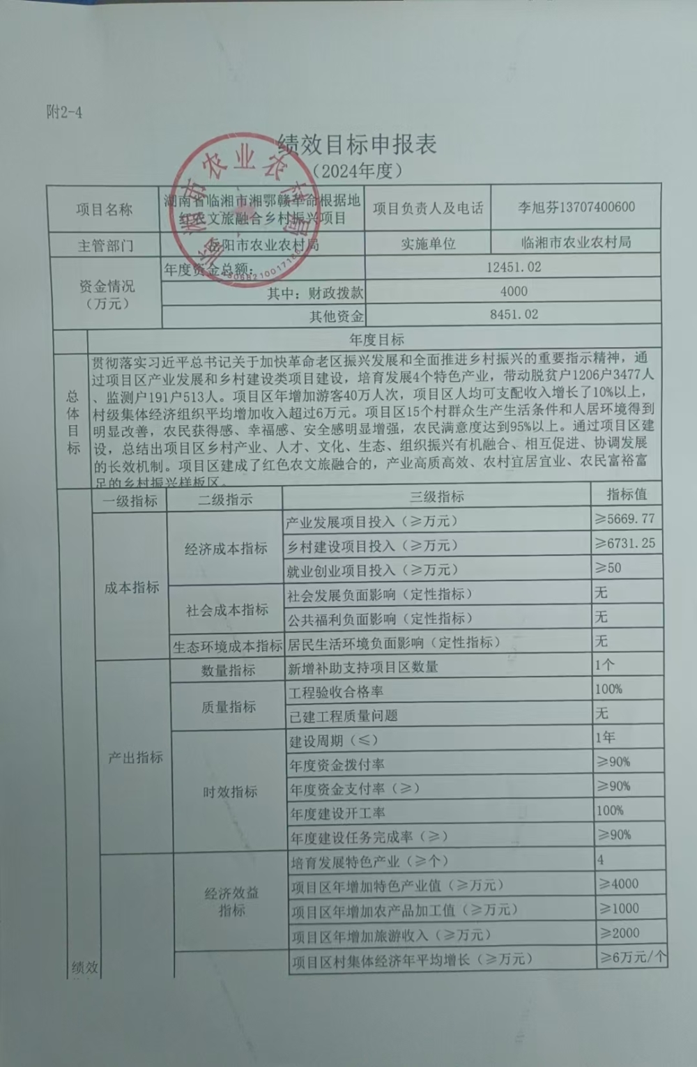 临湘市2024年湘鄂赣革命根据地红农文旅融合乡村振兴项目申报入库,现将绩效目标申报表进行公示。