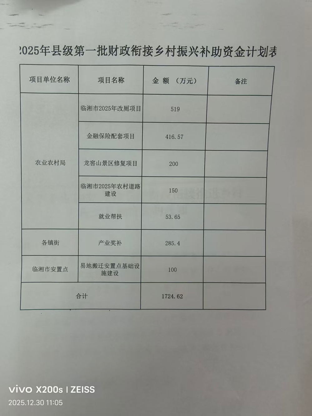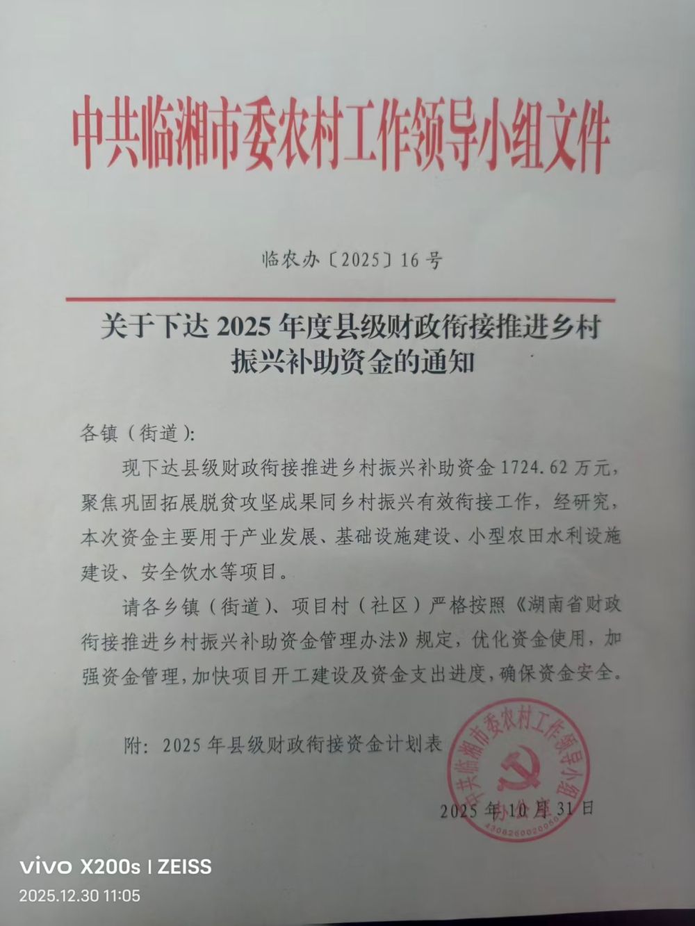 关于下达临湘市2025年度县级财政衔接推进乡村振兴补助资金的通知