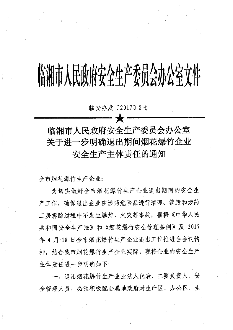 临湘市人民政府安全生产委员会办公室关于进一步明确退出期间烟花爆竹企业安全生产主体责任的通知