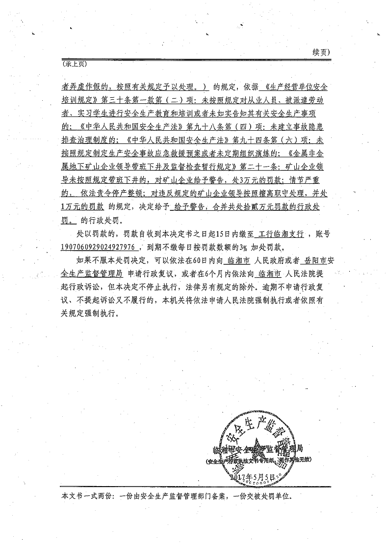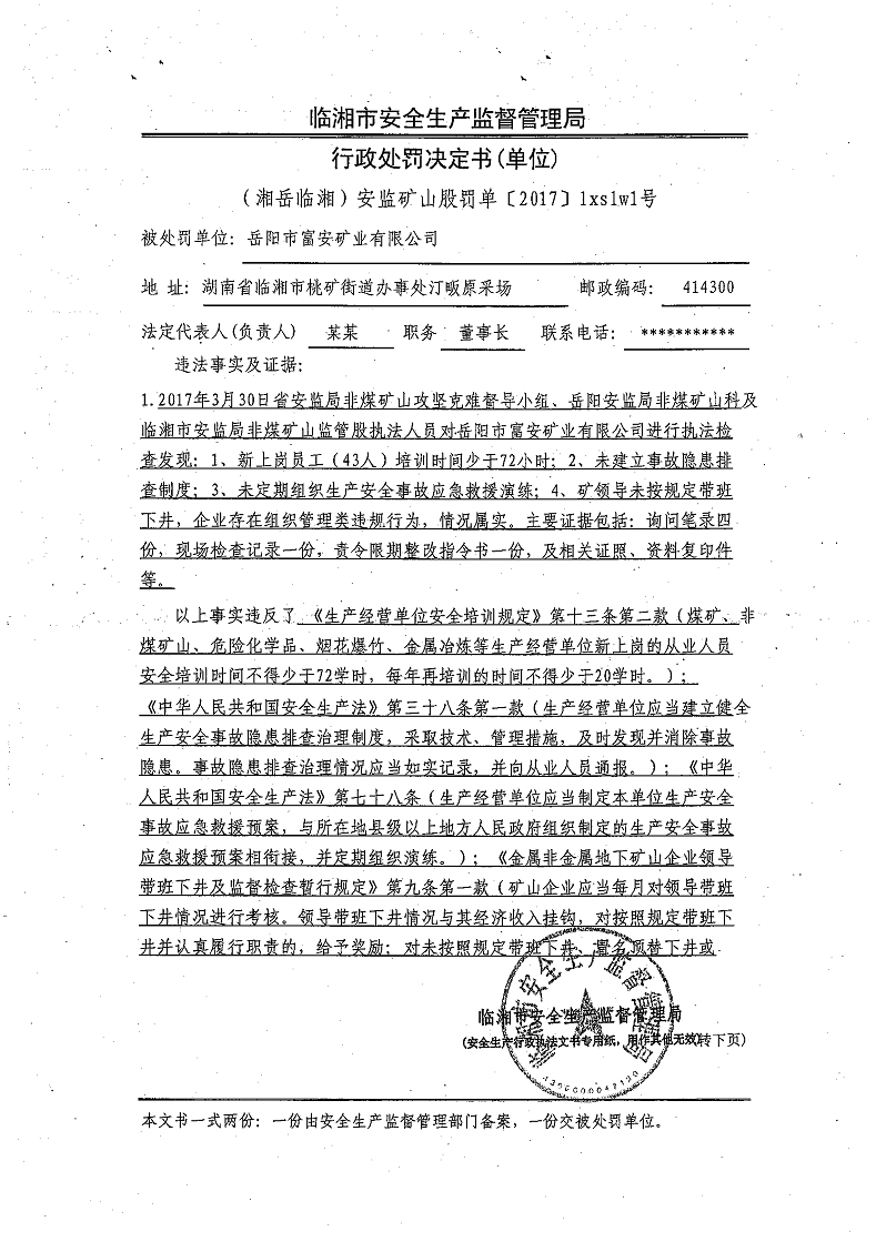 对岳阳市富安矿业有限公司的行政处罚决定书