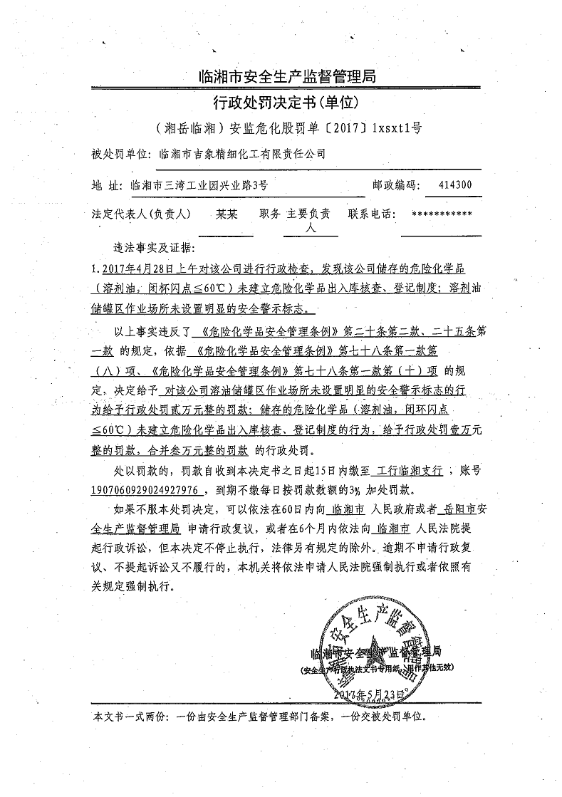 对临湘市吉象精细化工有限责任公司的行政处罚决定书