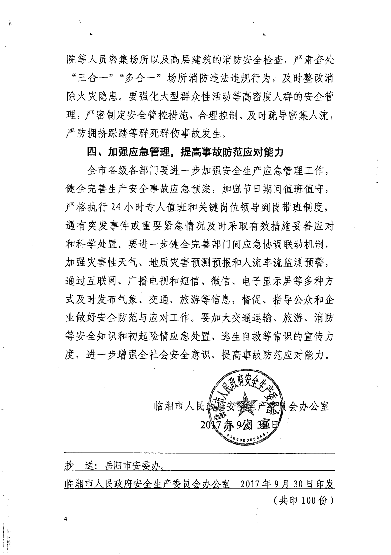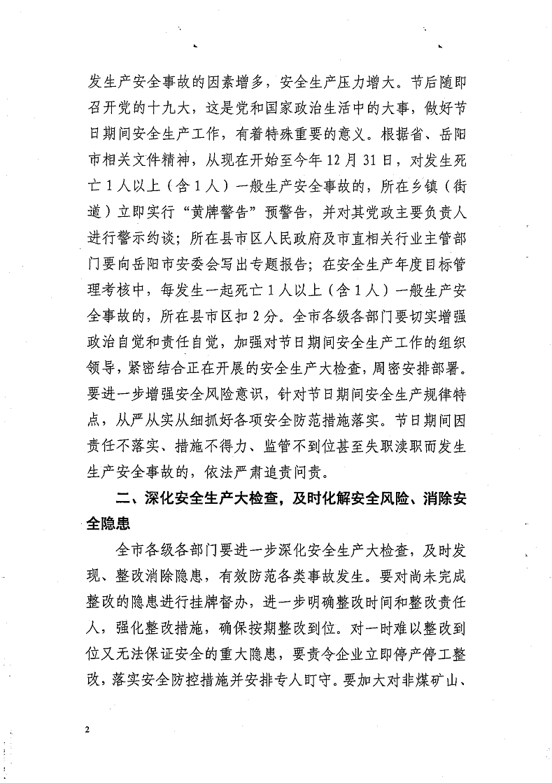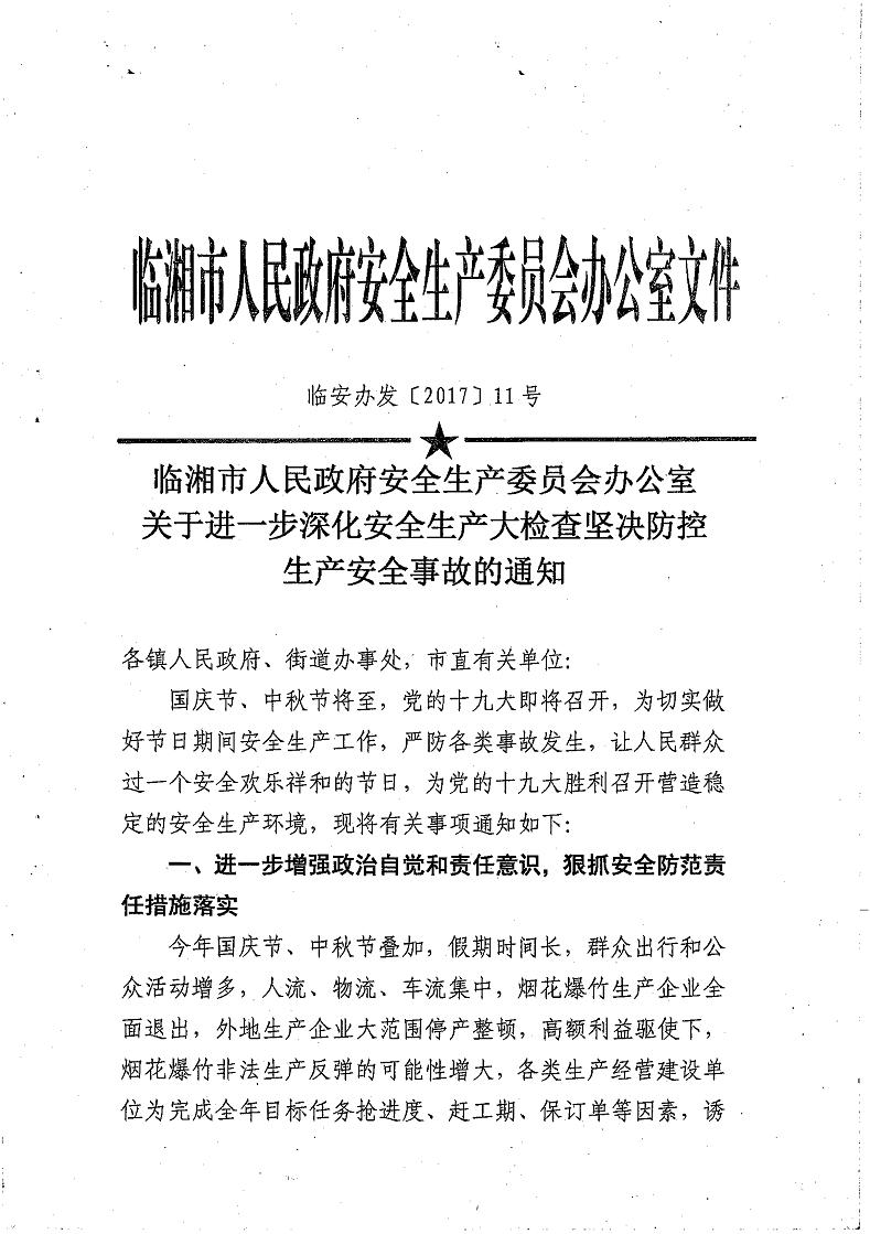 临湘市人民政府安全生产委员会办公室关于进一步深化安全生产大检查坚决防控生产安全事故的通知