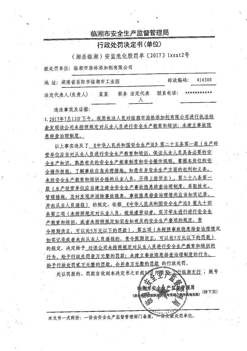 对临湘市浩林添加剂有限公司的行政处罚决定书