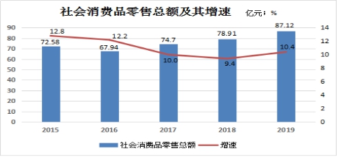 全年实现社会消费品零售总额87.12亿元,同比增长10.4%。按城乡分,城镇消费品零售额75.65亿元,同比增长10.1%;乡村消费品零售额11.47亿元,同比增长10.7%。按行业分,批发业零售额6.22亿元,增长10.7%;零售业零售额67.73亿元,增长10.4%;住宿业零售额5.94亿元,增长9.9%;餐饮业零售额7.23亿元,增长10.6%。
