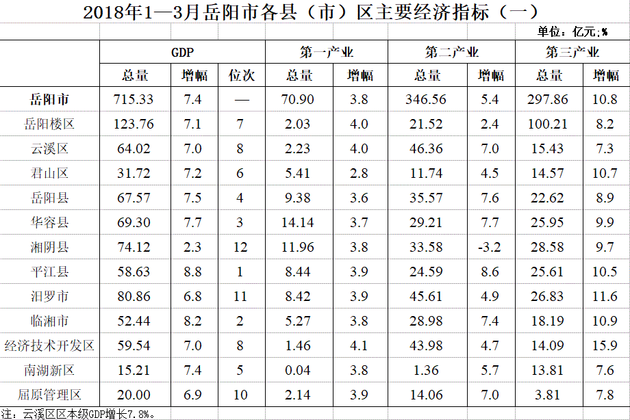 2018年1-3月岳阳市各县(市)区主要经济指标