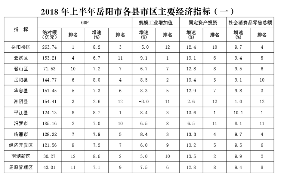 2018年上半年岳阳市各县市区主要经济指标