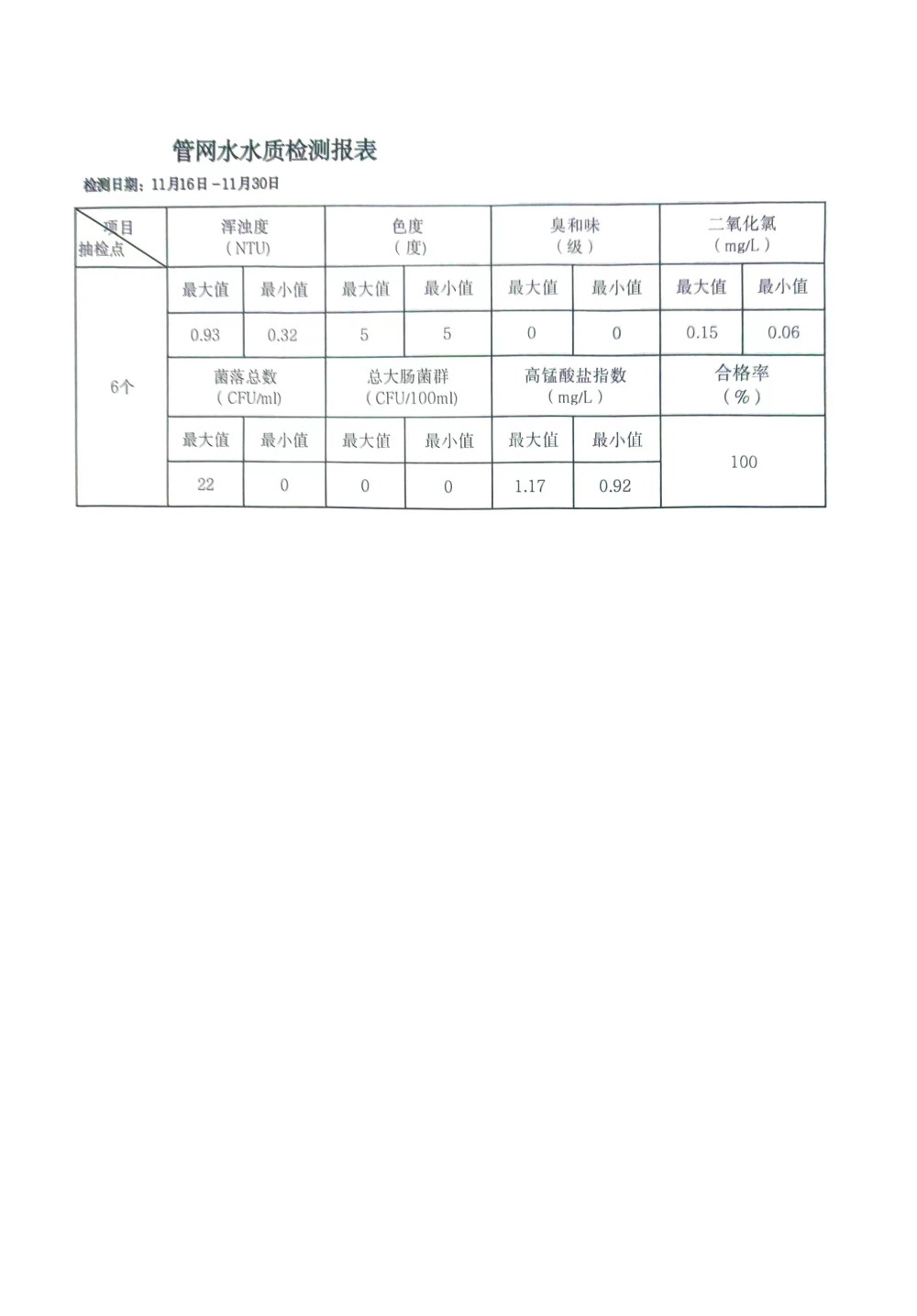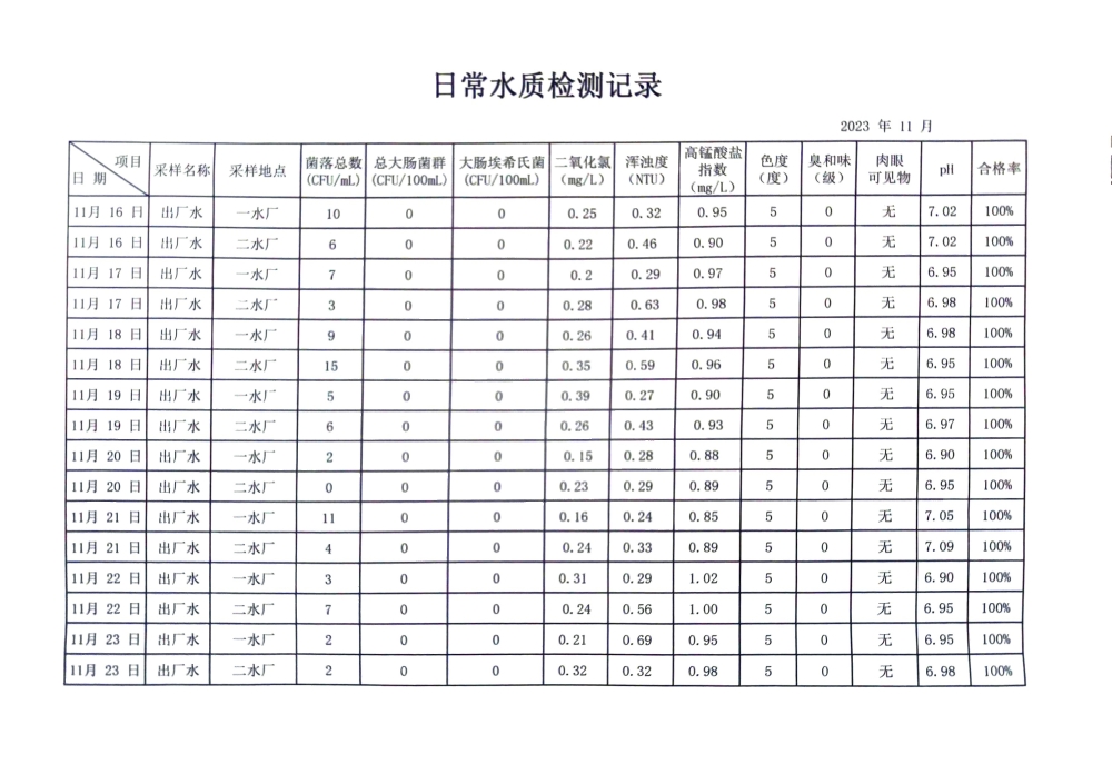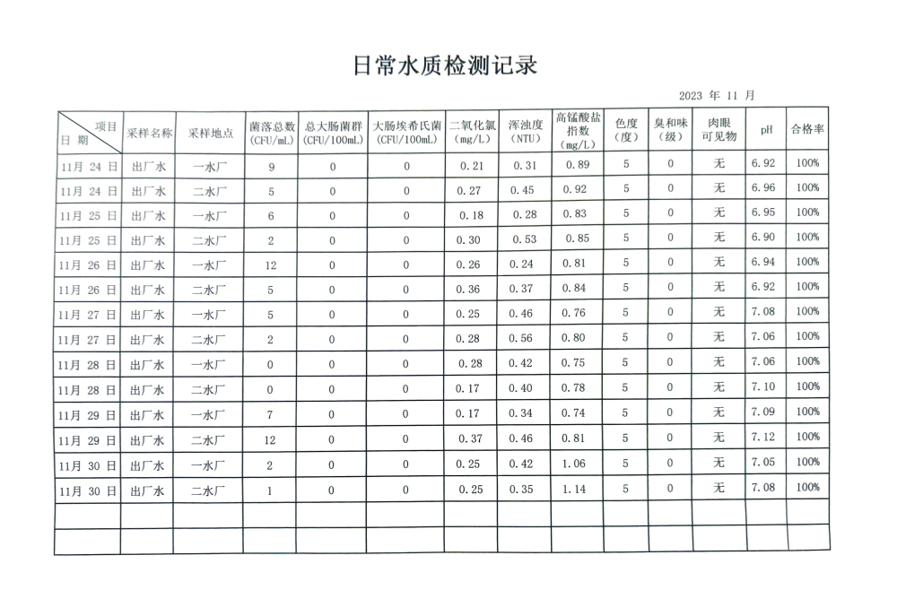 兴临自来水公司日检、半月检水质信息公开(11月下半月)