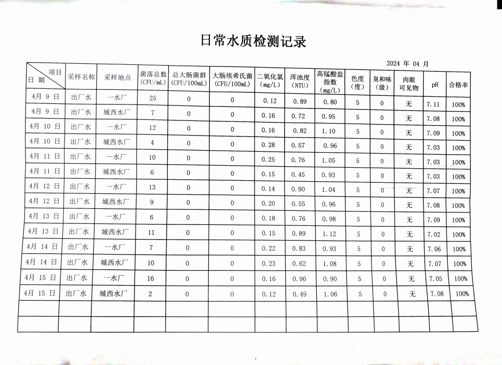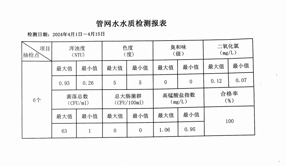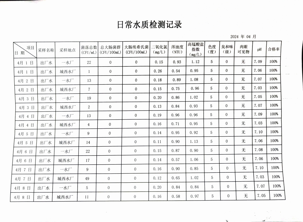 兴临自来水公司日检、半月检水质信息公开(4月上半月)
