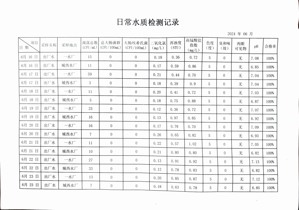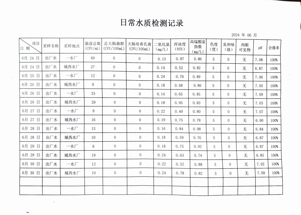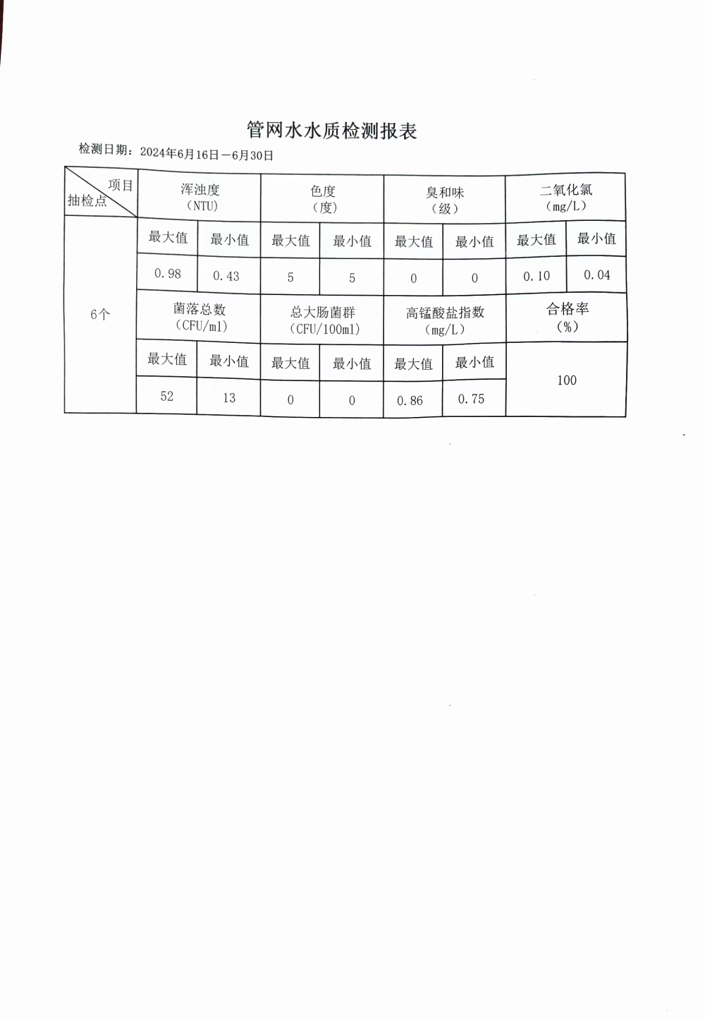 6月下半月兴临自来水公司日检、半月检水质信息公开