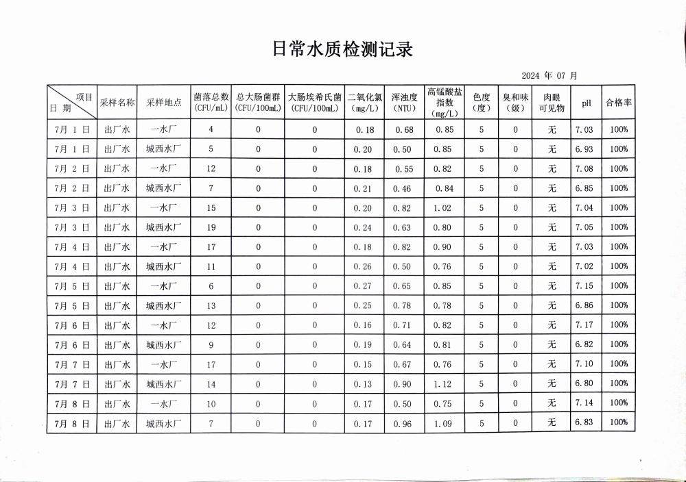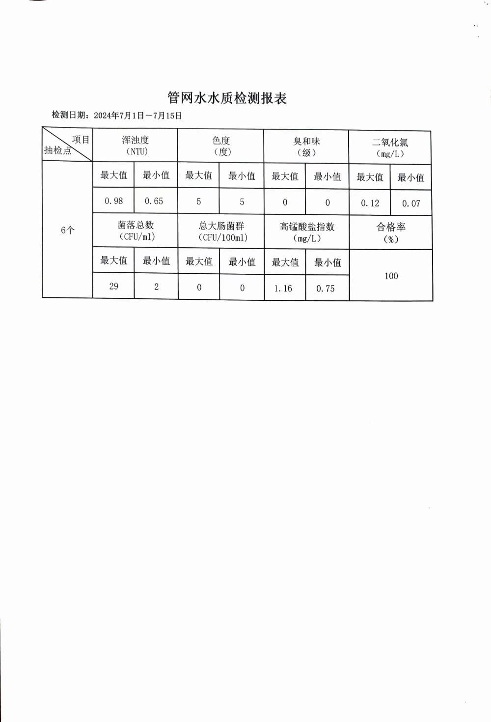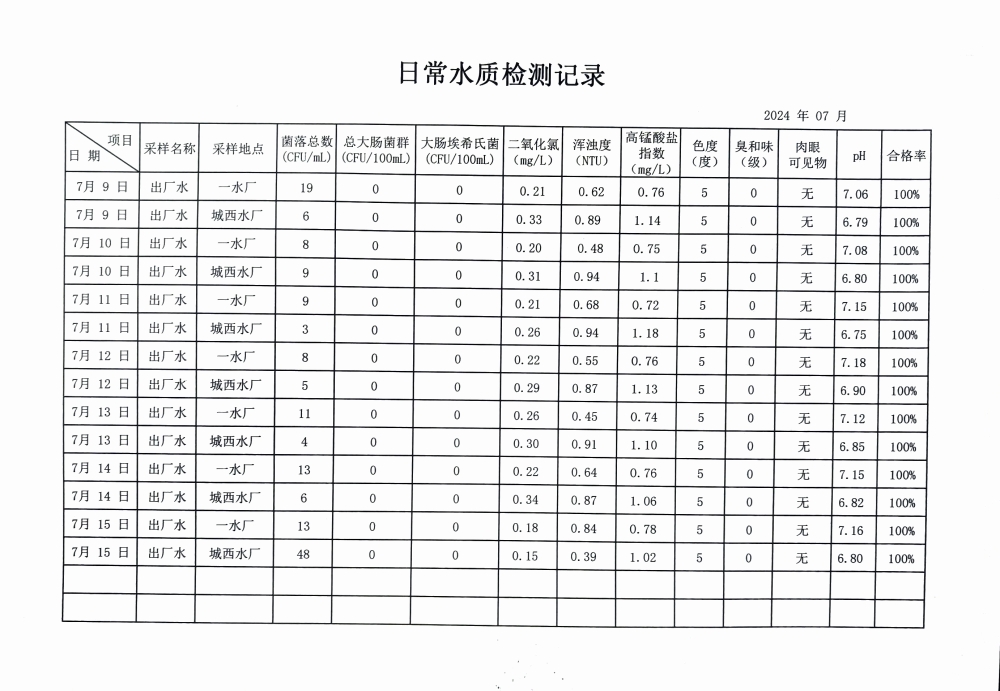 7月上半月兴临自来水公司日检、半月检水质信息公开