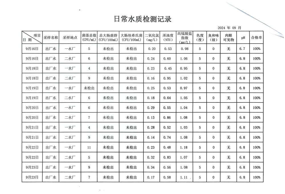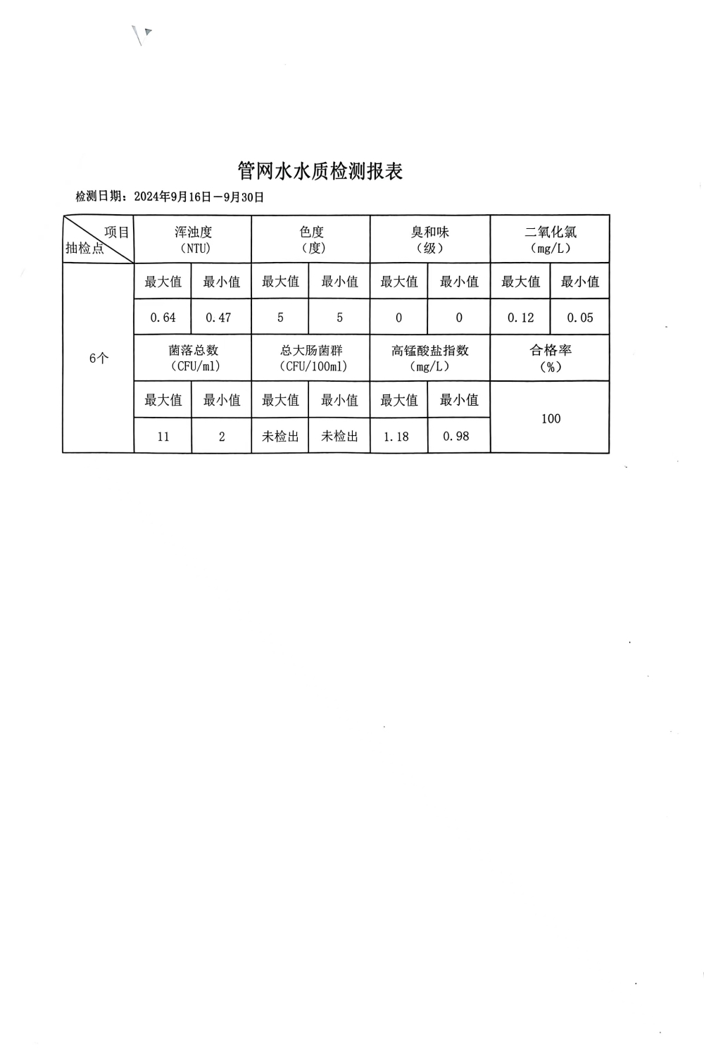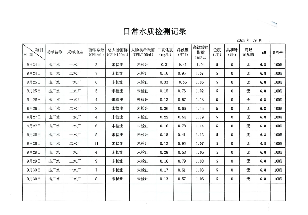 9月下半月兴临自来水公司日检、半月检水质信息公开