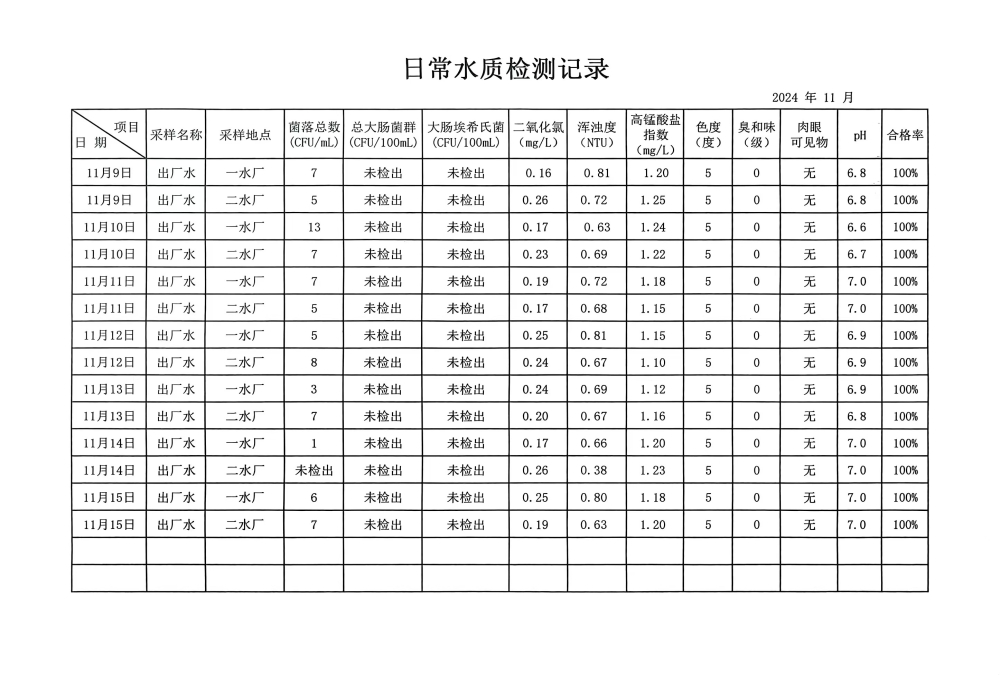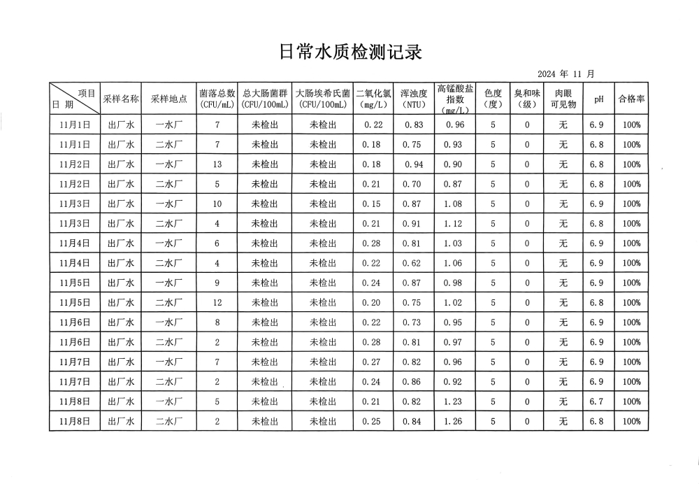 11月上半月兴临自来水公司日检、半月检水质信息公开