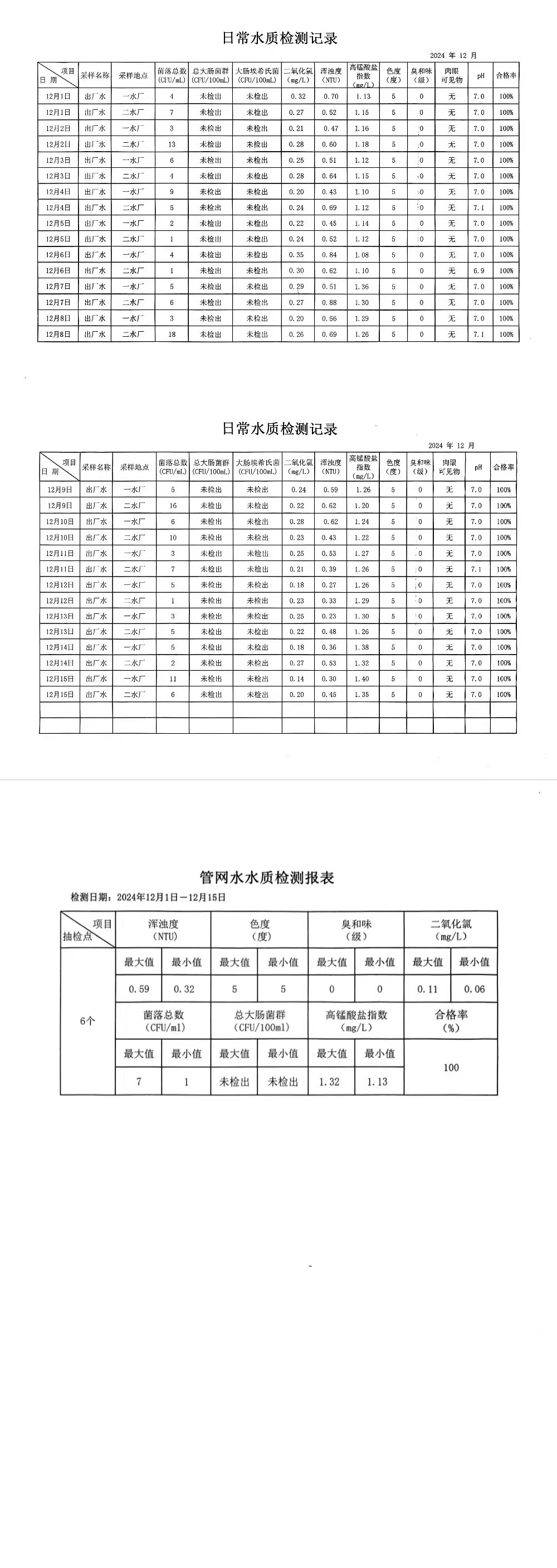 12月上半月兴临自来水公司日检、半月检水质信息公开