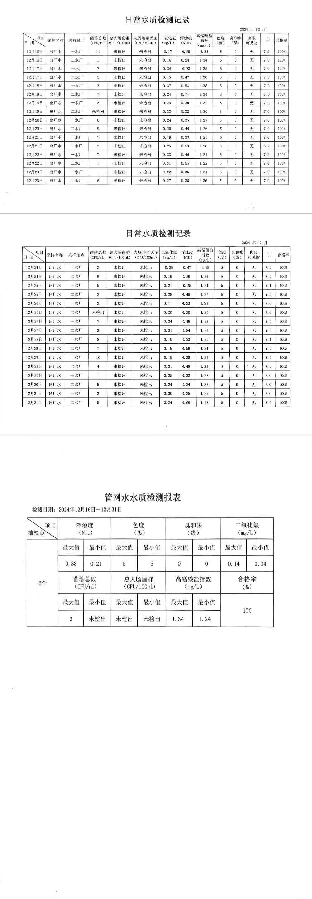 12月下半月兴临自来水公司日检、半月检水质信息公开