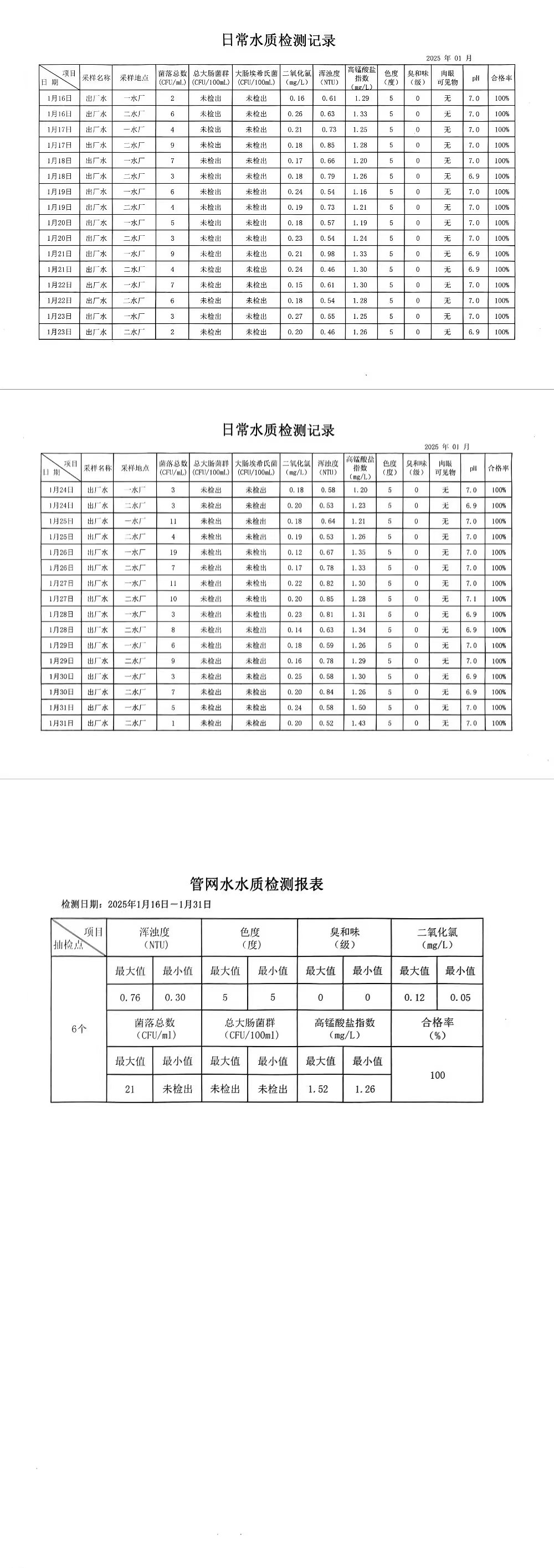 1月下半月兴临自来水公司日检、半月检水质信息公开