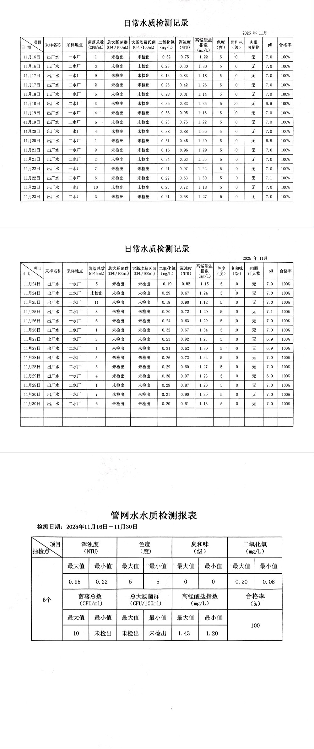 2025年11月下半月兴临自来水公司日检、半月检水质信息公开