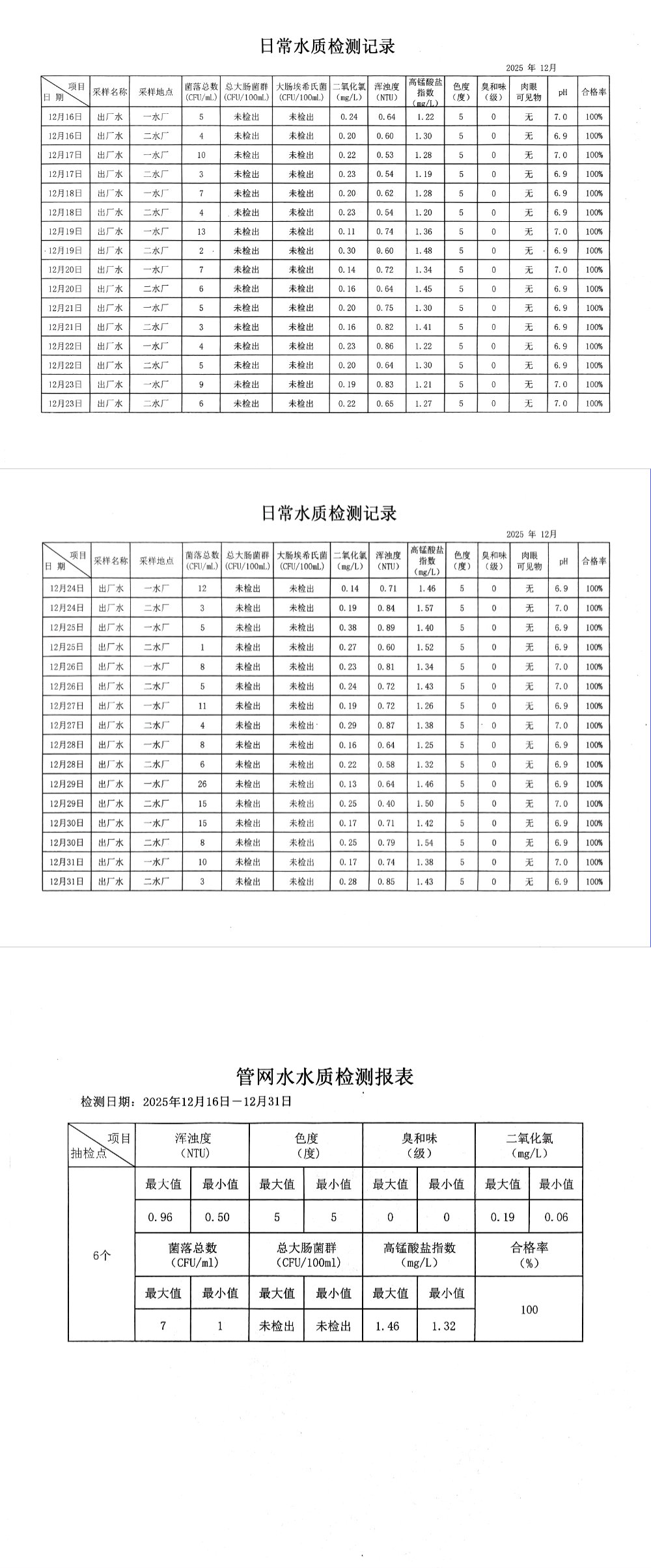 2025年12月下半月兴临自来水公司日检、半月检水质信息公开