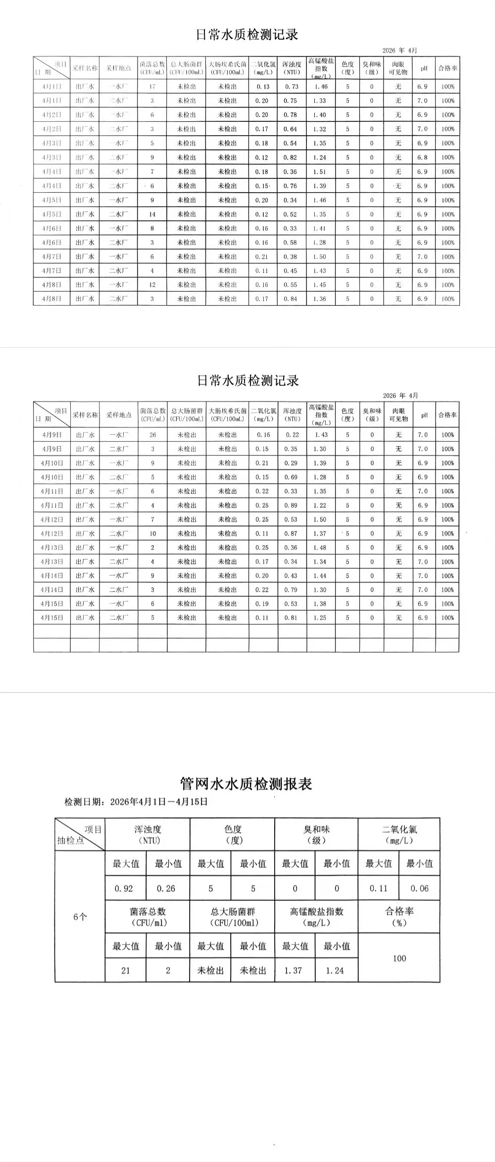 2026年4月上半月兴临自来水公司日检、半月检水质信息公开