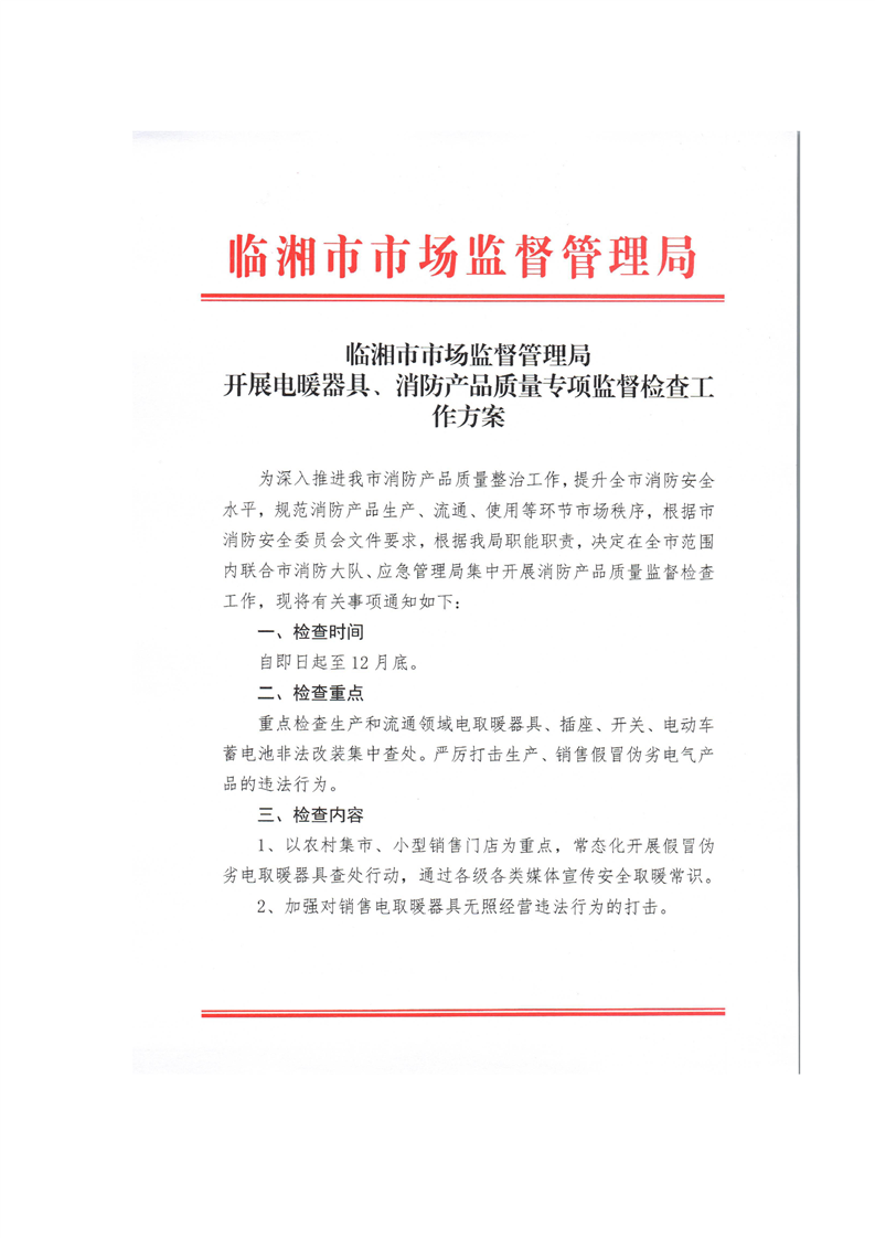 临湘市市场监督管理局开展电暖器具、消防产品质量专项监督检查工作方案