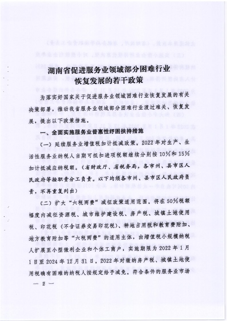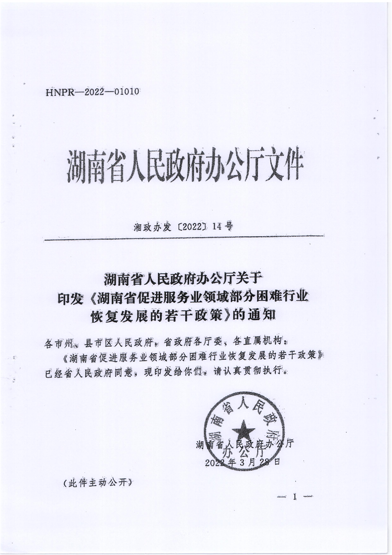 关于印发《湖南省促进服务业领域部分困难行业恢复发展的若干政策》的通知