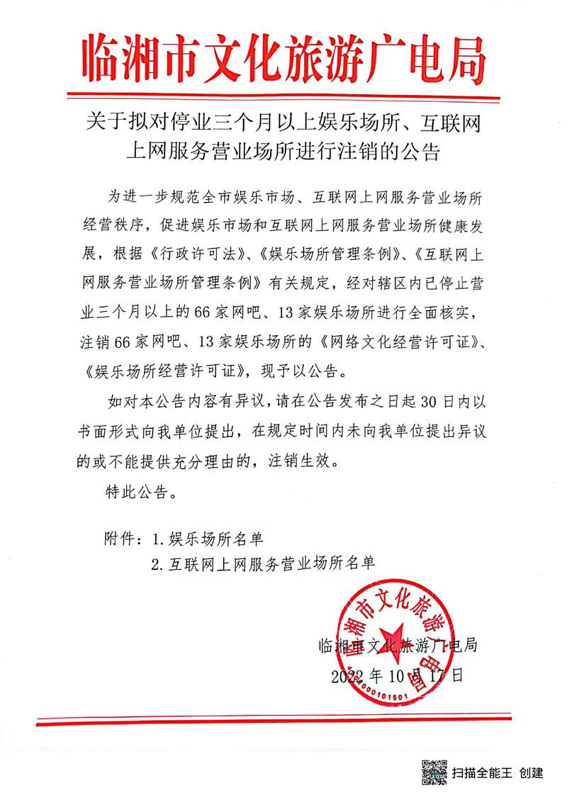 关于拟对停业三个月以上娱乐场所互联网上网服务营业场所进行注销的公告